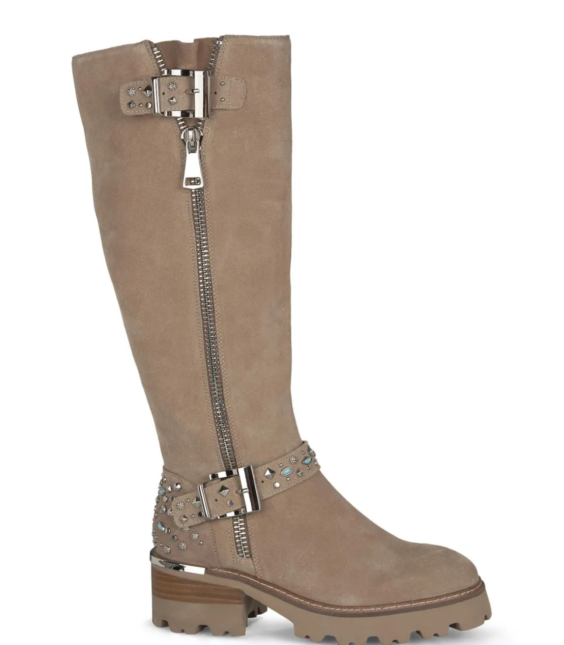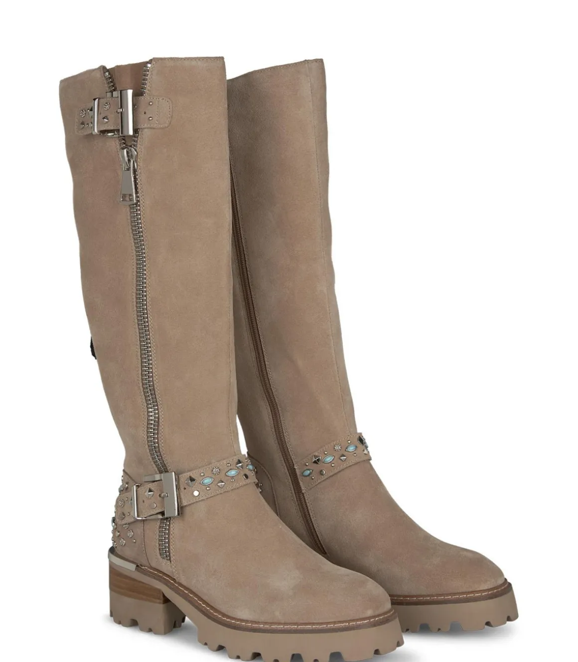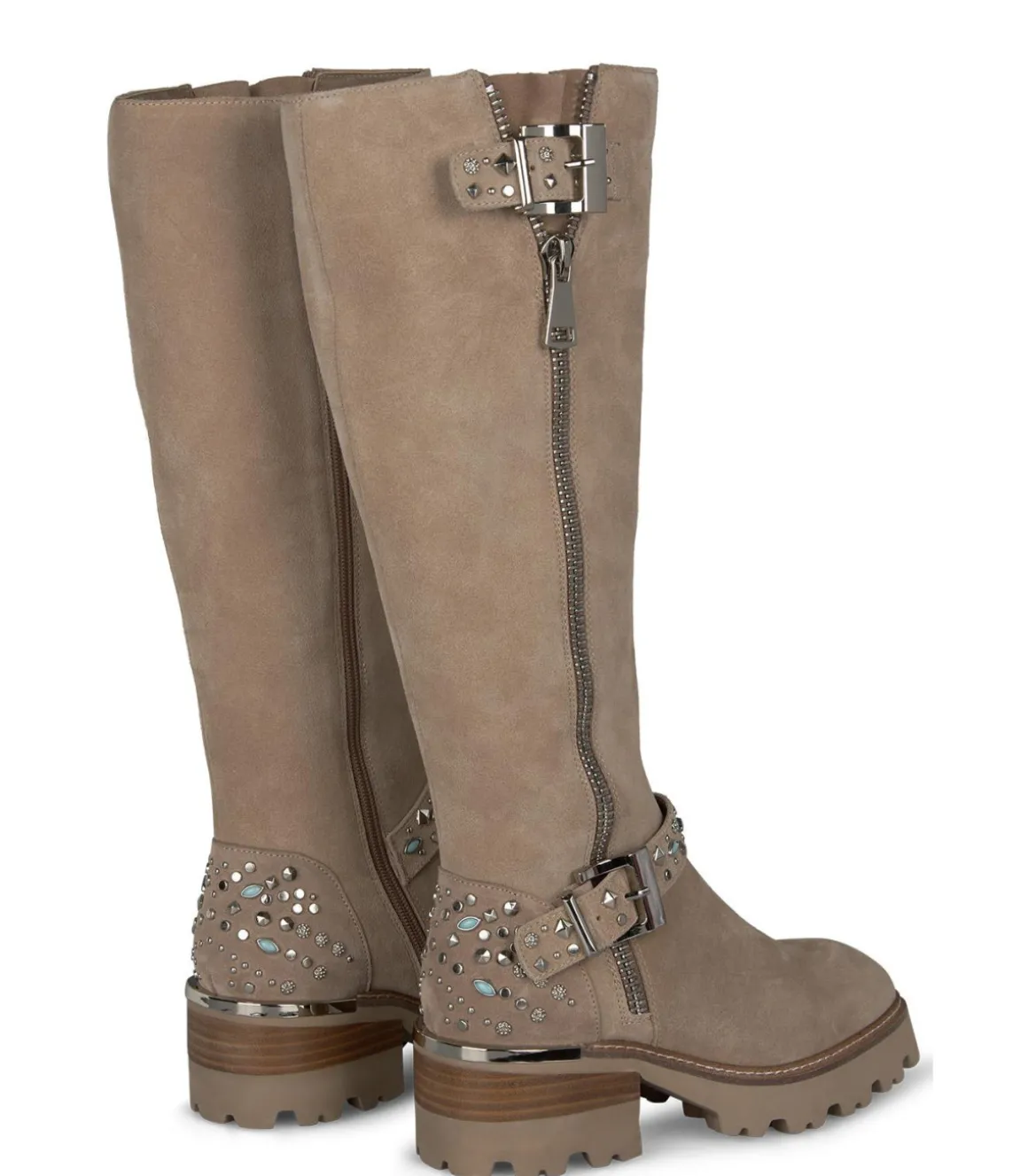 Bota de mujer con suela track y hebillas en la caña. Con detalle de tachas y puntera redondeada, confeccionado en piel y con cierre de cremallera. La altura del tacón es de 5,8cm y la caña de la bota mide 40,5cm.