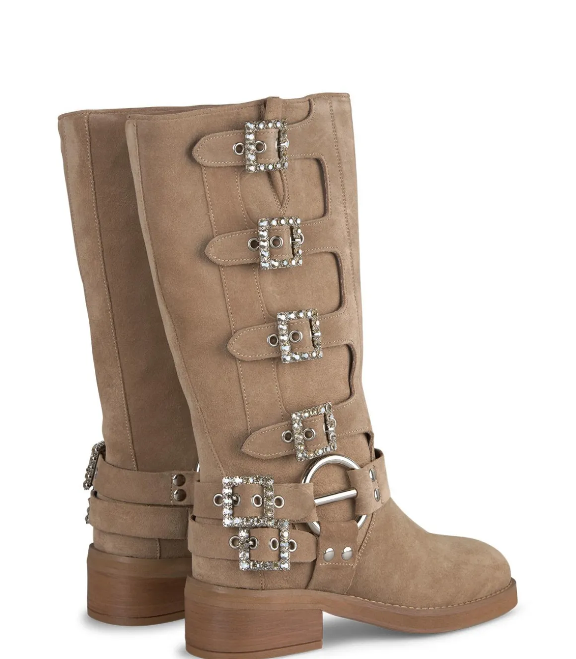 Bota biker de mujer con caña alta y hebillas con pedrería. La puntera es redondeada. Confeccionada en piel. La altura del tacón es de 3,8cm y la altura de la caña es de 23cm.