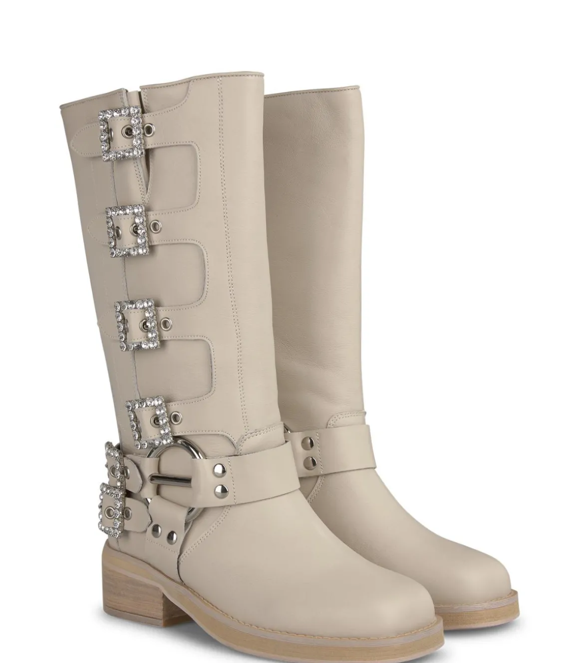 Bota biker de mujer con caña alta y hebillas con pedrería. La puntera es redondeada. Confeccionada en piel. La altura del tacón es de 3,8cm y la altura de la caña es de 23cm.