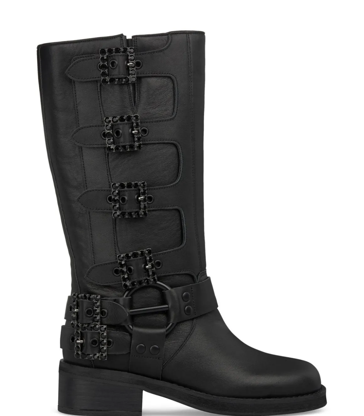 Bota biker de mujer con caña alta y hebillas con pedrería. La puntera es redondeada. Confeccionada en piel. La altura del tacón es de 3,8cm y la altura de la caña es de 23cm.