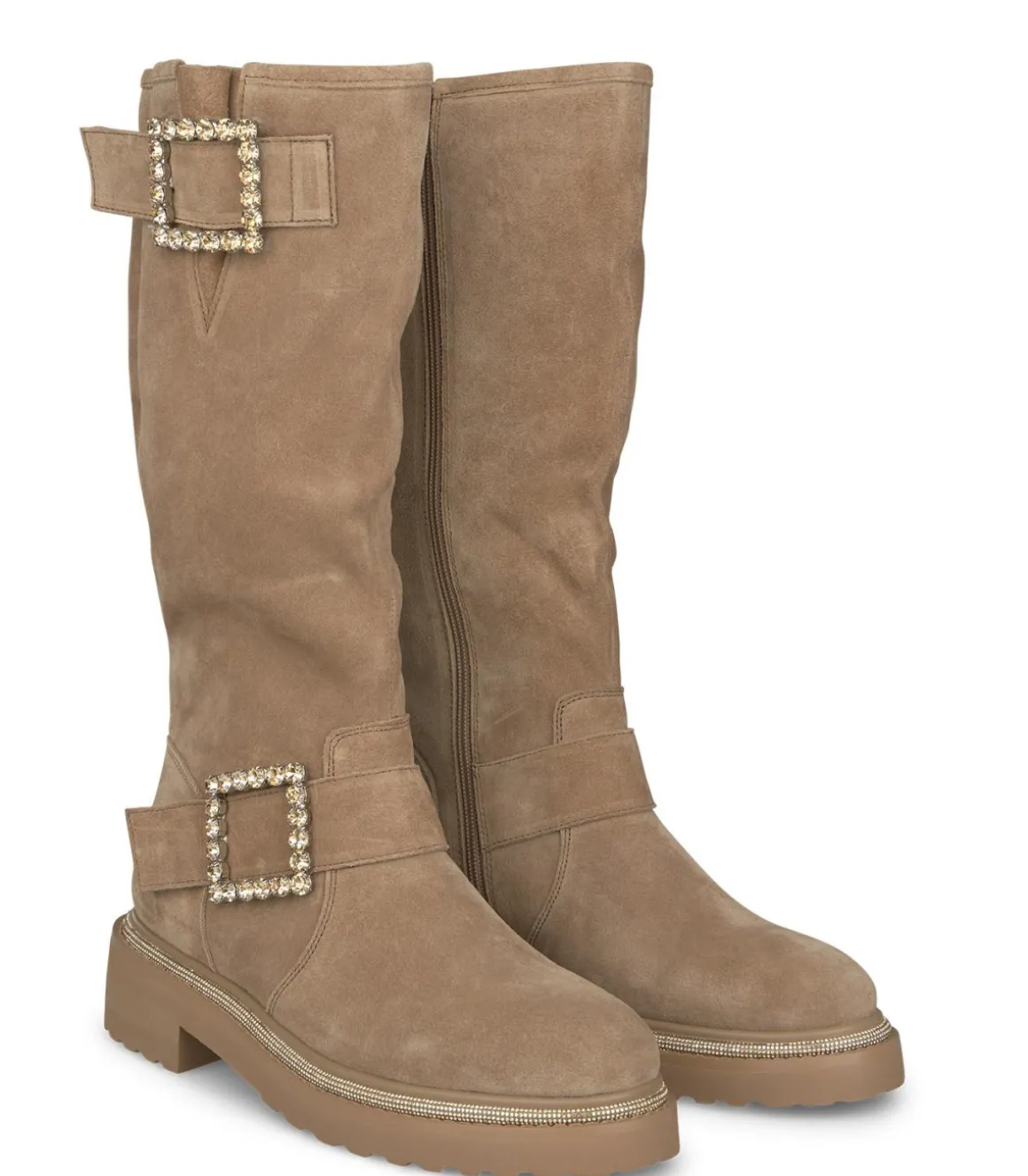 Bota de mujer realizada en piel. Detalle de hebilla con pedrería. Cierre con cremallera. La altura del tacón es de 5cm.