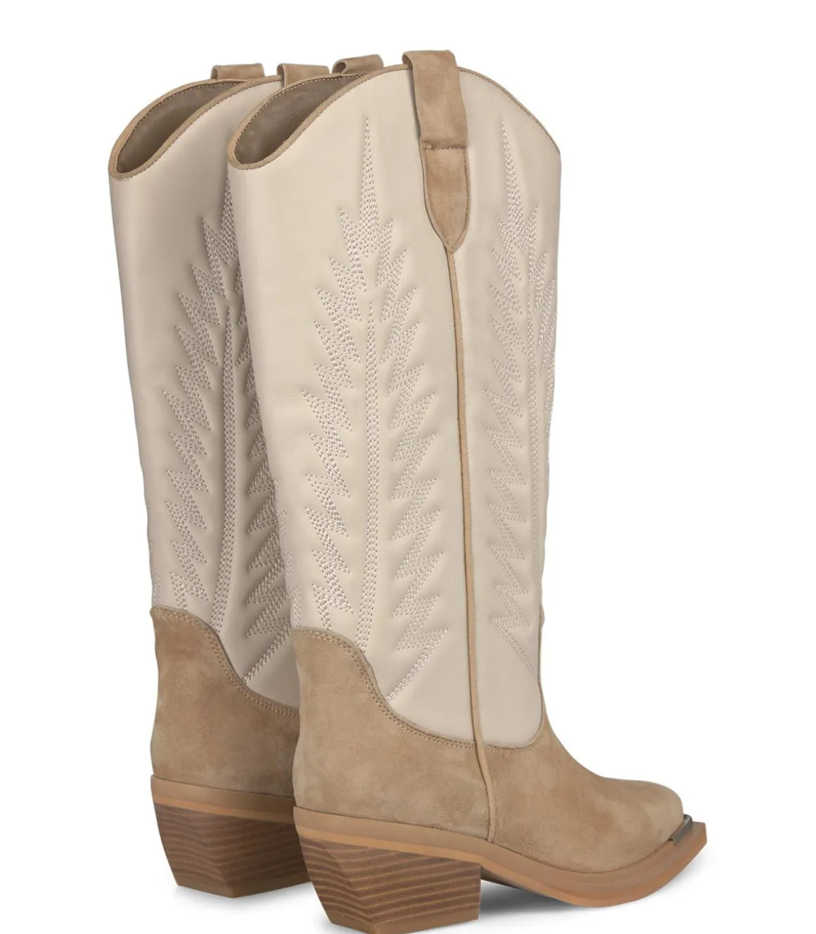 Bota plana combi de mujer con bordados en la caña. Con puntera cuadrada, confeccionado en piel. La altura del tacón es de 6cm y la caña de la bota mide 30cm.