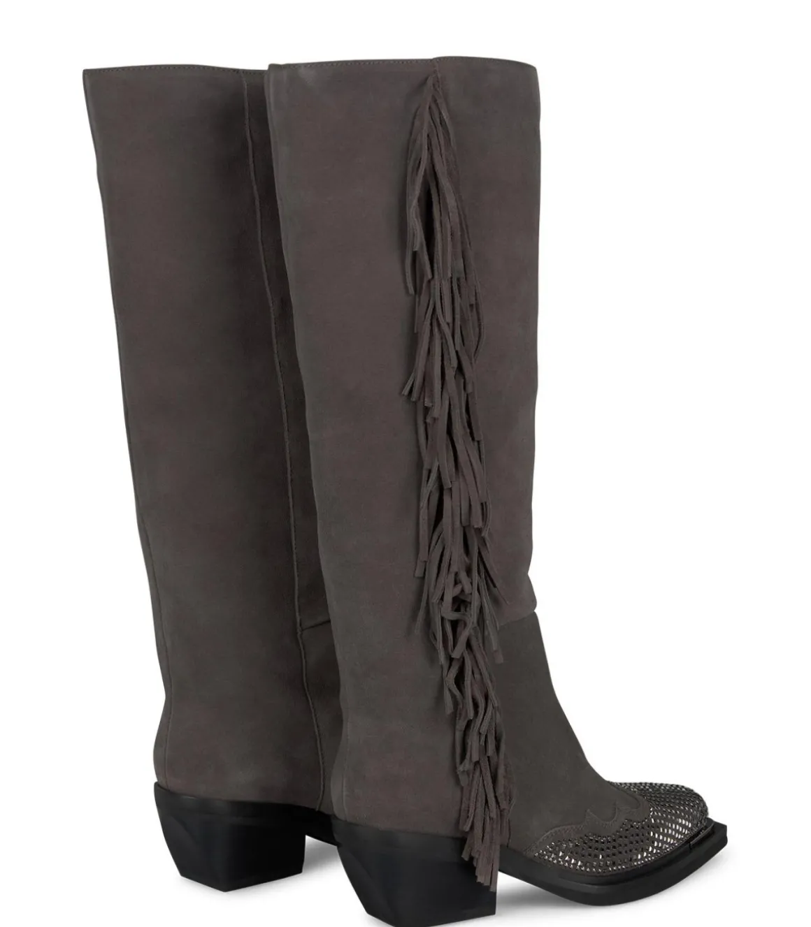 Bota plana de mujer con flecos. Con puntera redondeada, confeccionado en piel. La altura del tacón es de 6cm y la caña de la bota mide 41cm.