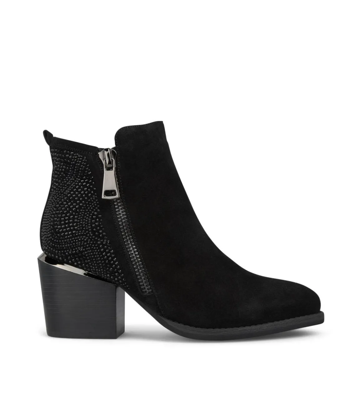 Botín de tacón de mujer con tachas y cremallera lateral. Puntera redondeada y cierre con cremallera. La altura del tacón de tipo bloque es de 7,2cm y la altura de la caña es de 13,5cm.