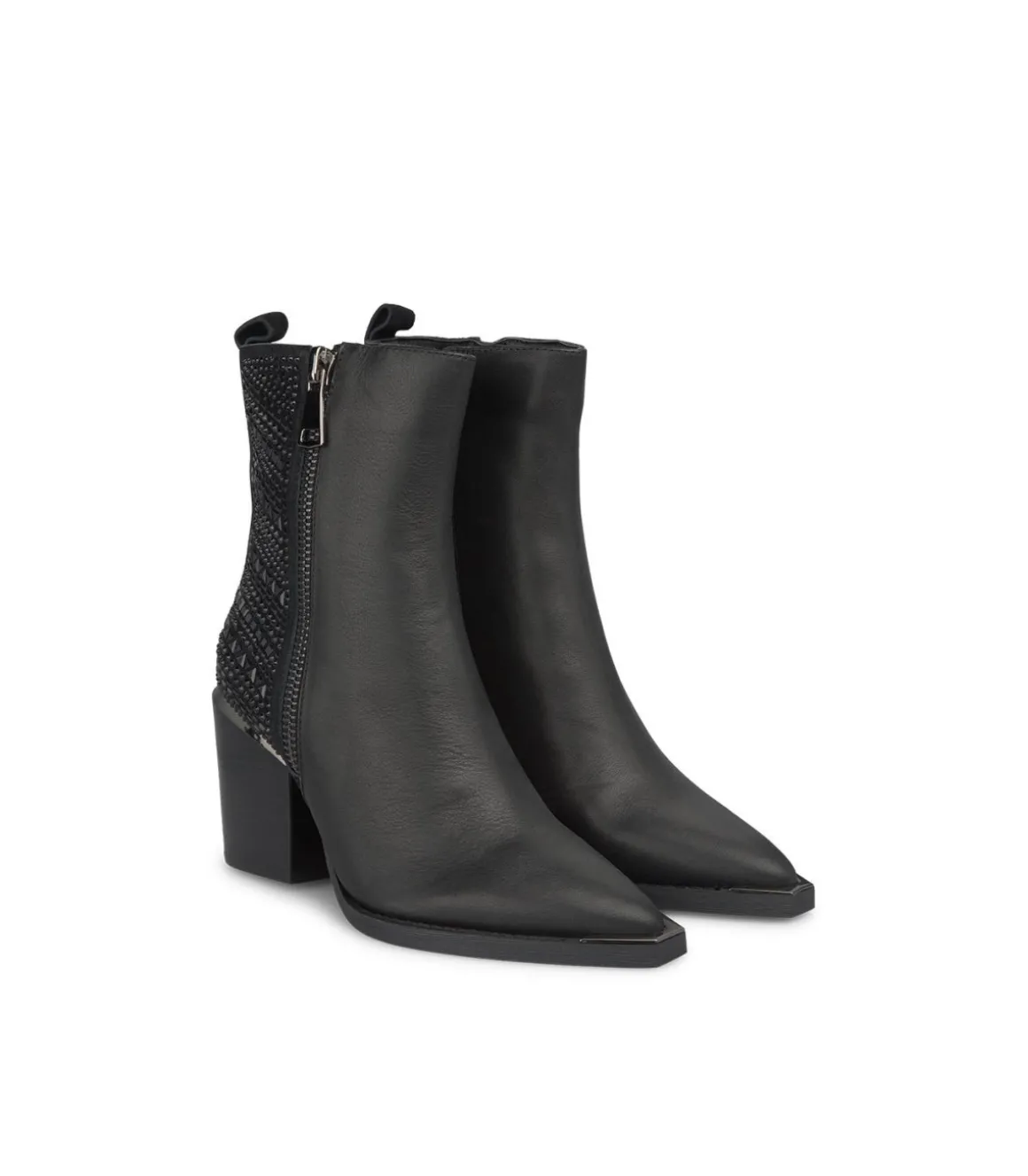 Botín de tacón de mujer con brillos en la parte trasera y cremallera lateral. Puntera afilada y tacón de tipo bloque….