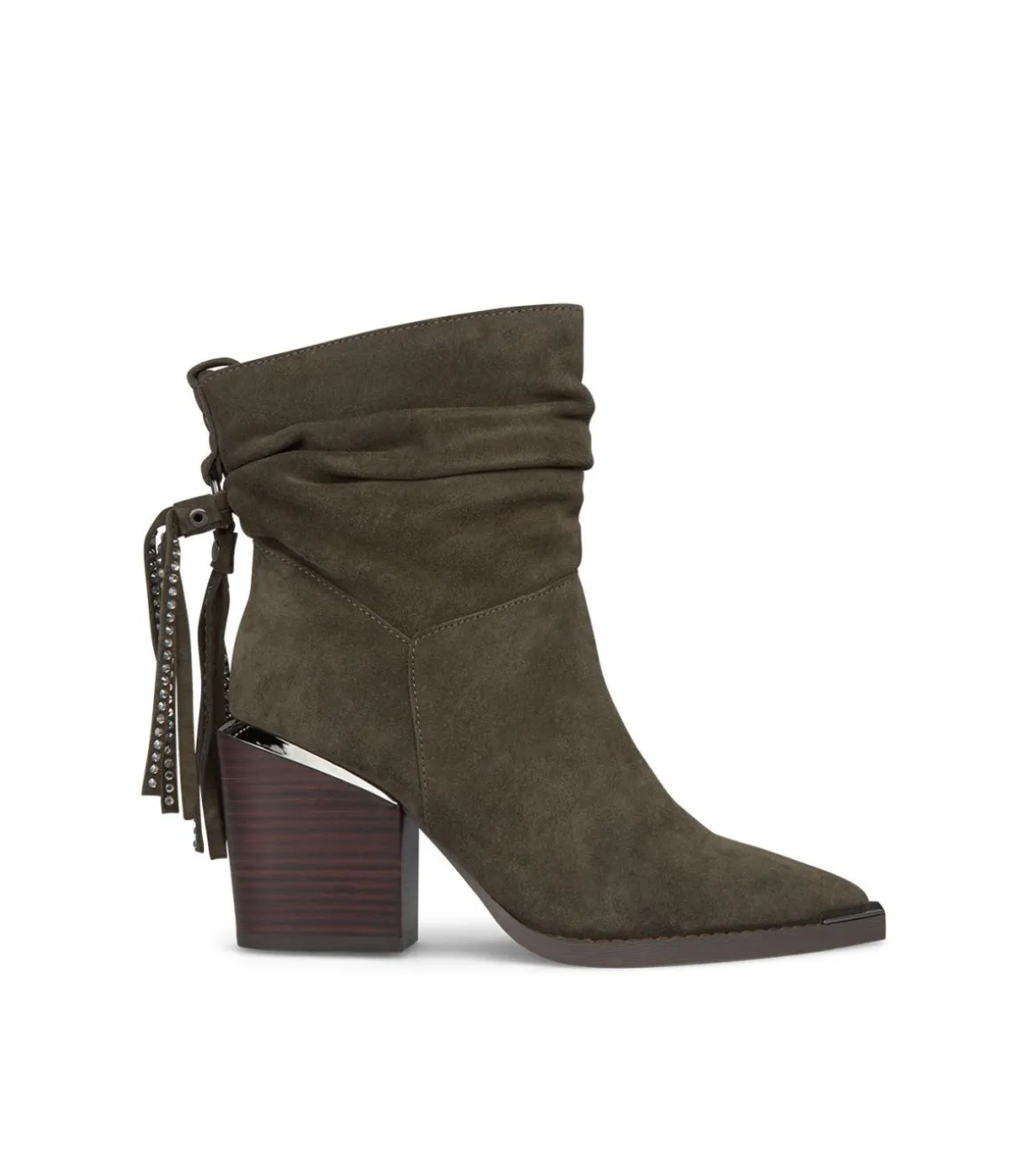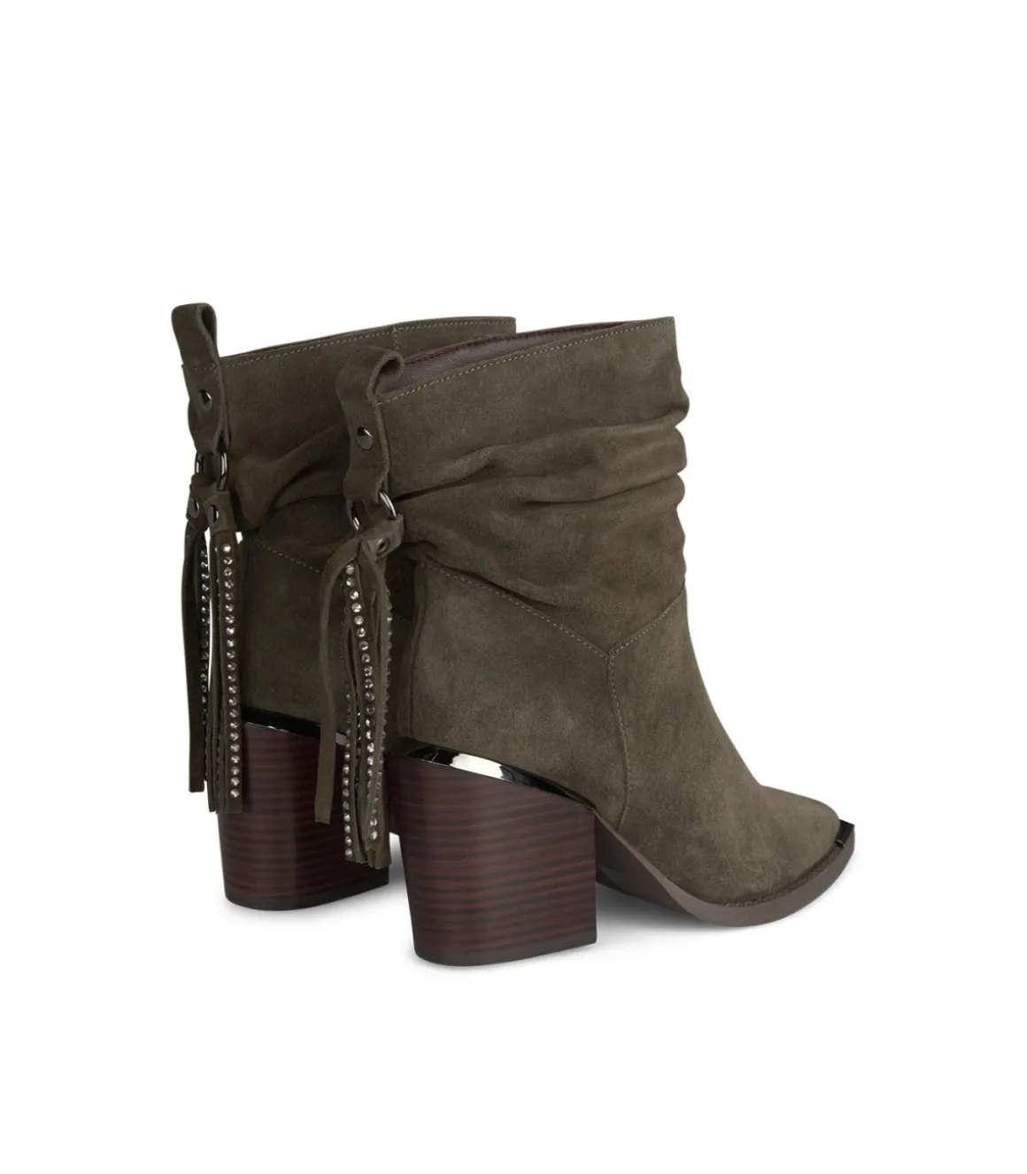 Botín de tacón de mujer con la caña fruncida y flecos traseros. Confeccionado en piel con la puntera afilada y sin cierre. La altura del tacón bloque es de 8,5cm y la caña del botín mide 18cm.