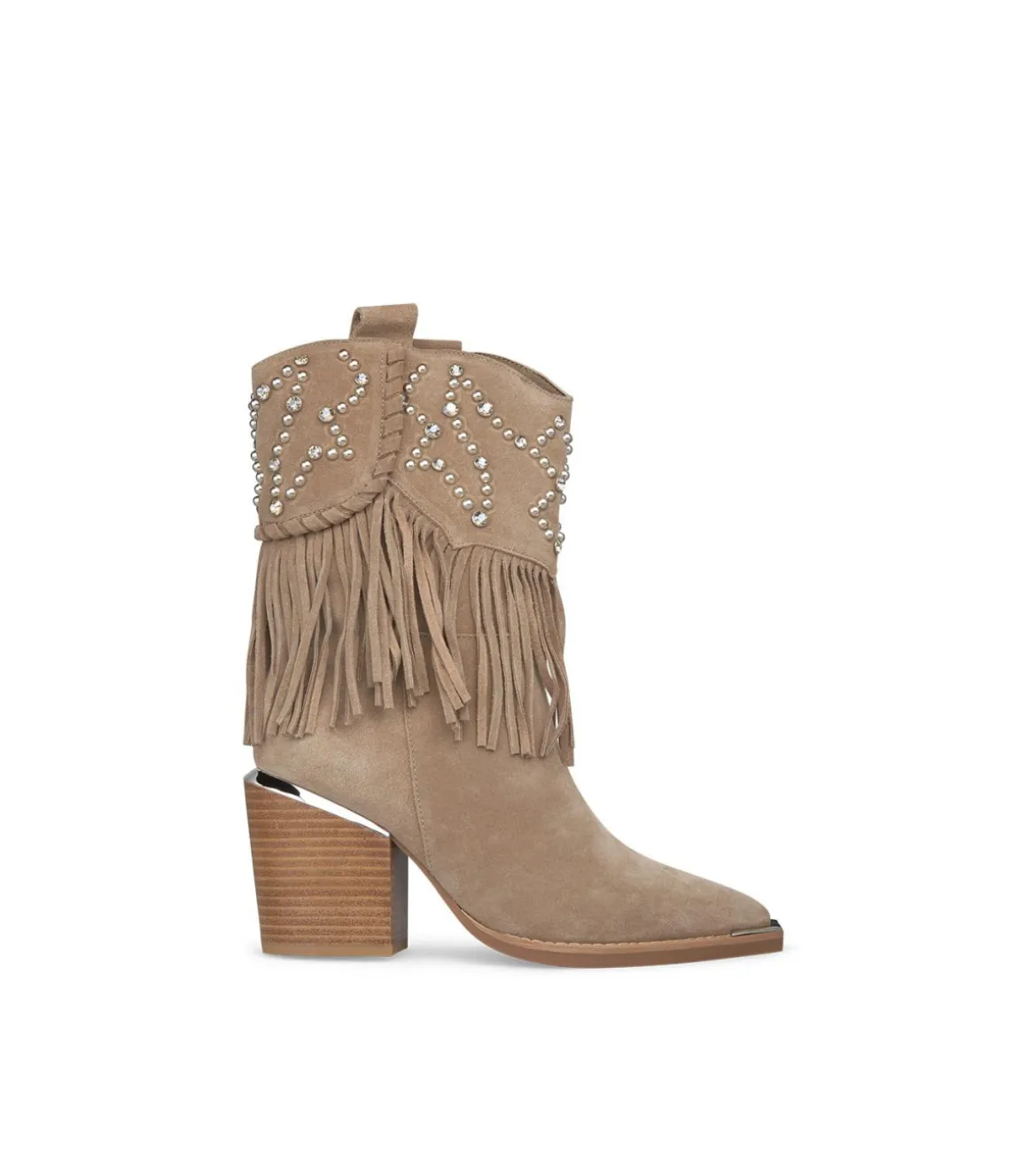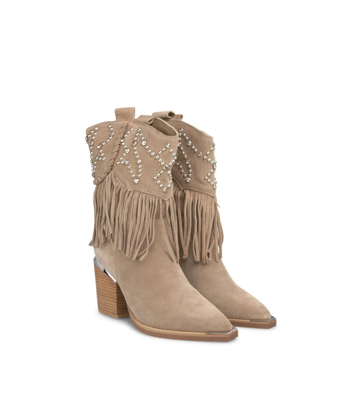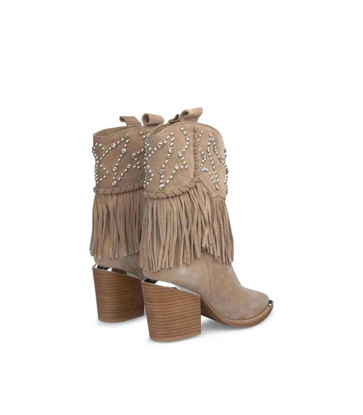 Botín de tacón de mujer con la caña baja. La caña con detalles de tachas y flecos mide 21cm. Con puntera afilada y sin cierre. La altura del tacón es de 8,5cm.