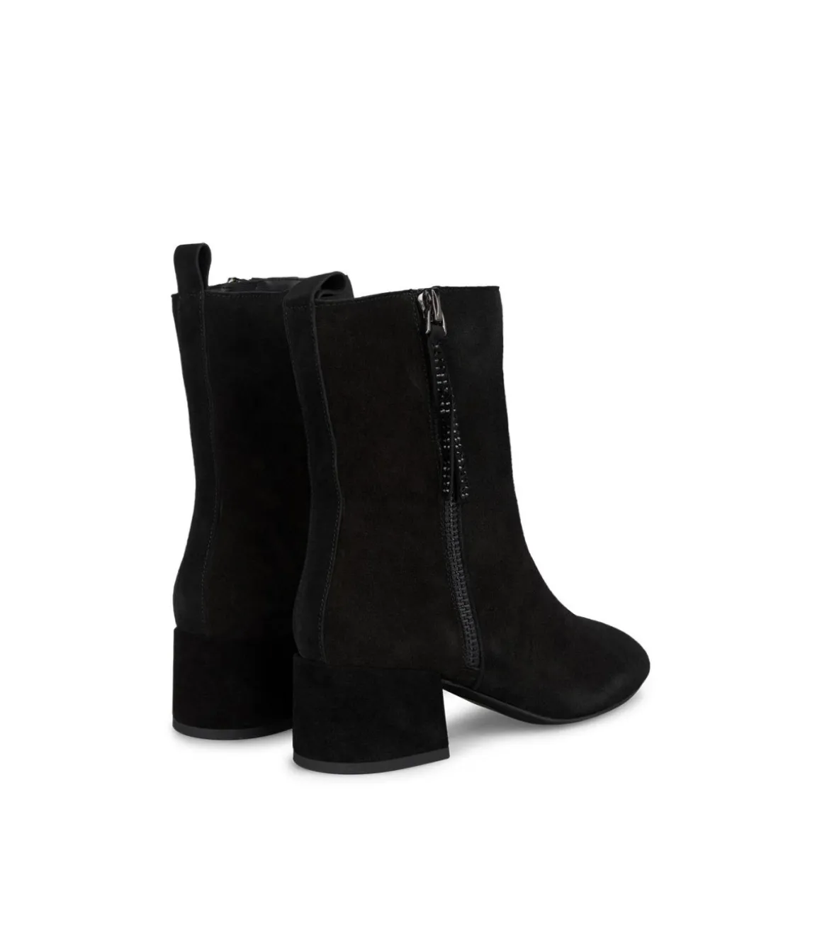Botín de tacón de mujer con cremallera. Puntera redondeada y cierre con cremallera. La altura del tacón de tipo bloque es de 5cm y la altura de la caña es de 18cm.