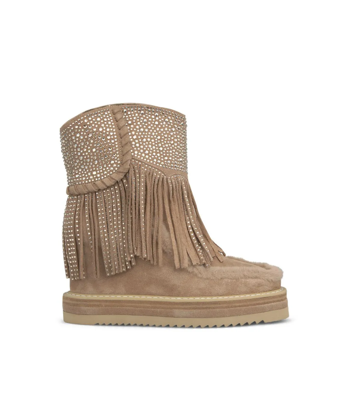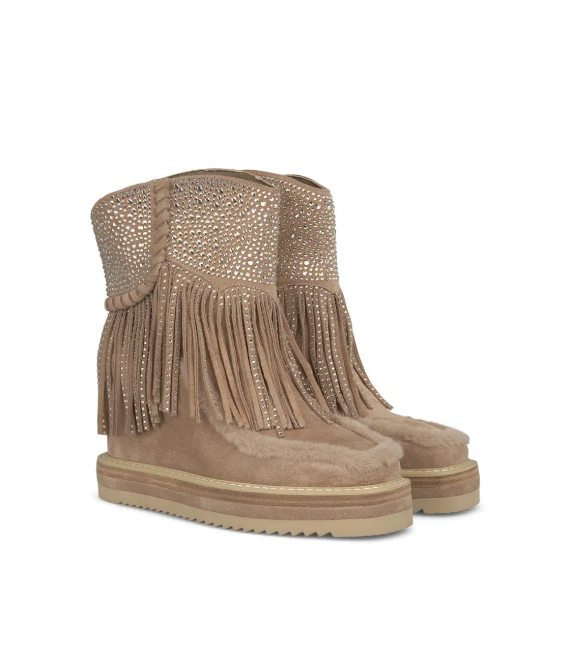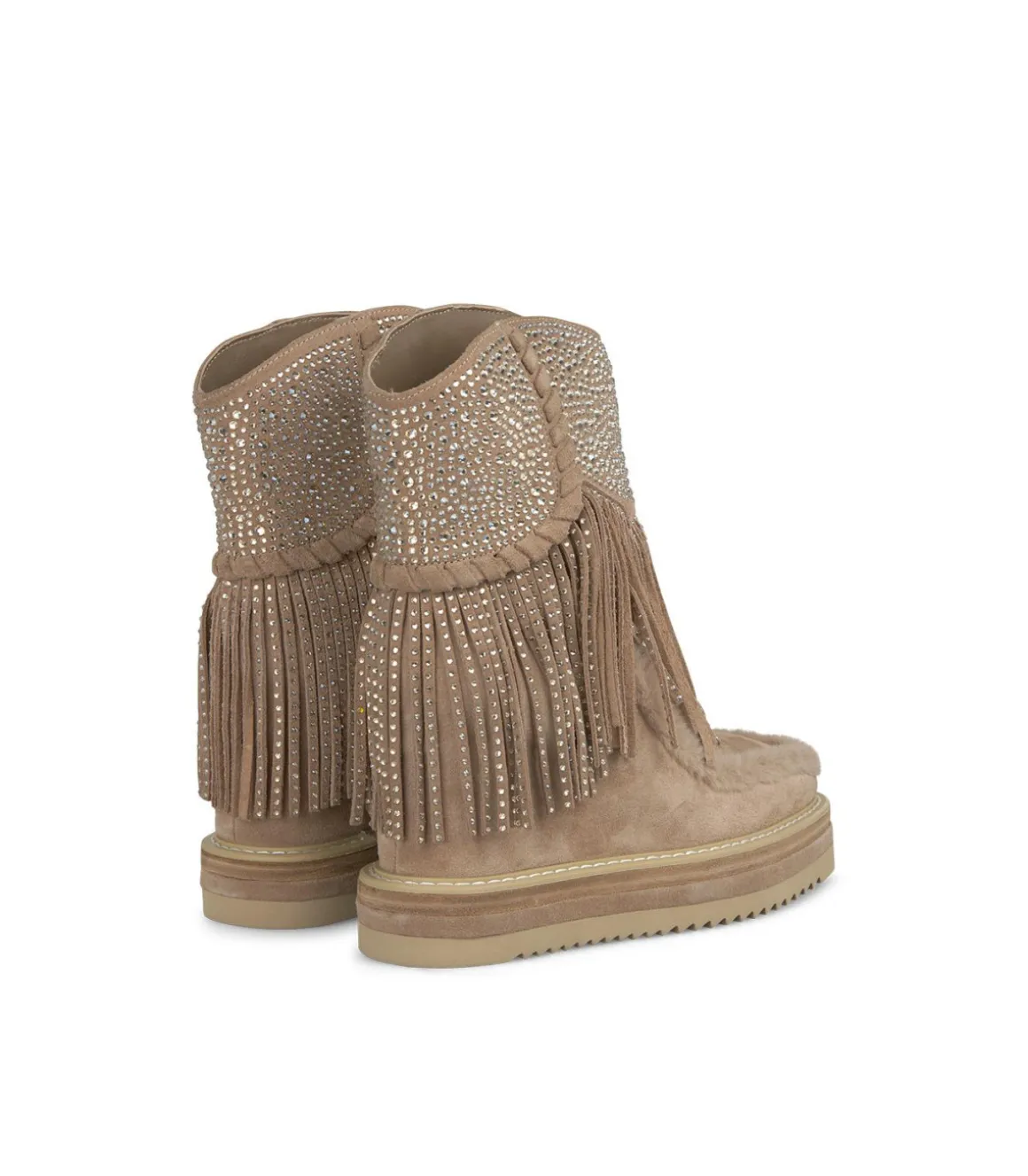 Botín de mujer con cuña interna de pelo con flecos. Puntera redondeada, con cordones confeccionado en piel y sin cierre. La altura del tacón es de 9cm y la caña de la bota mide 14cm.