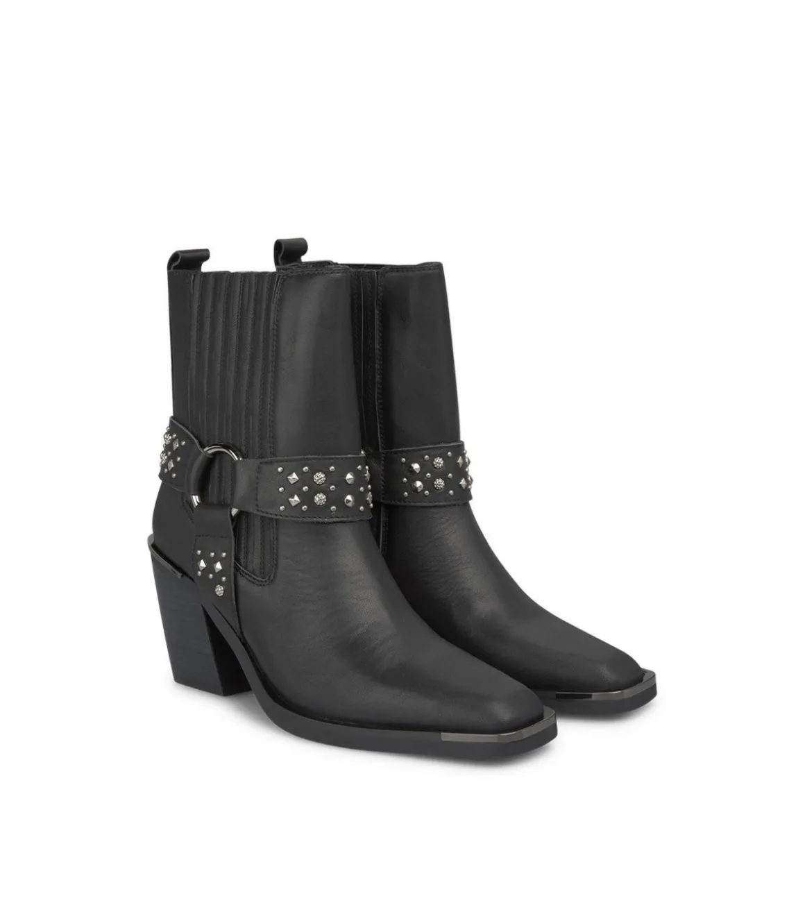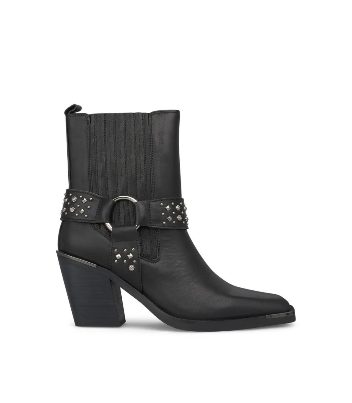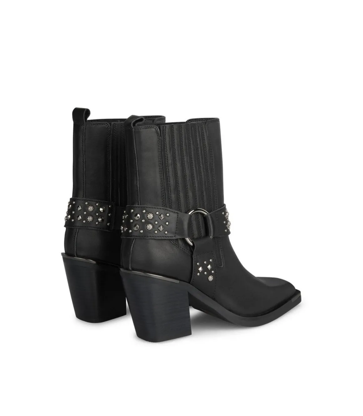 Botín de tacón de mujer con tachas y detalle metálico. Puntera cuadrada y tacón de tipo bloque inclinado. La altura del tacón es de 8cm y la caña del botín mide 16cm.