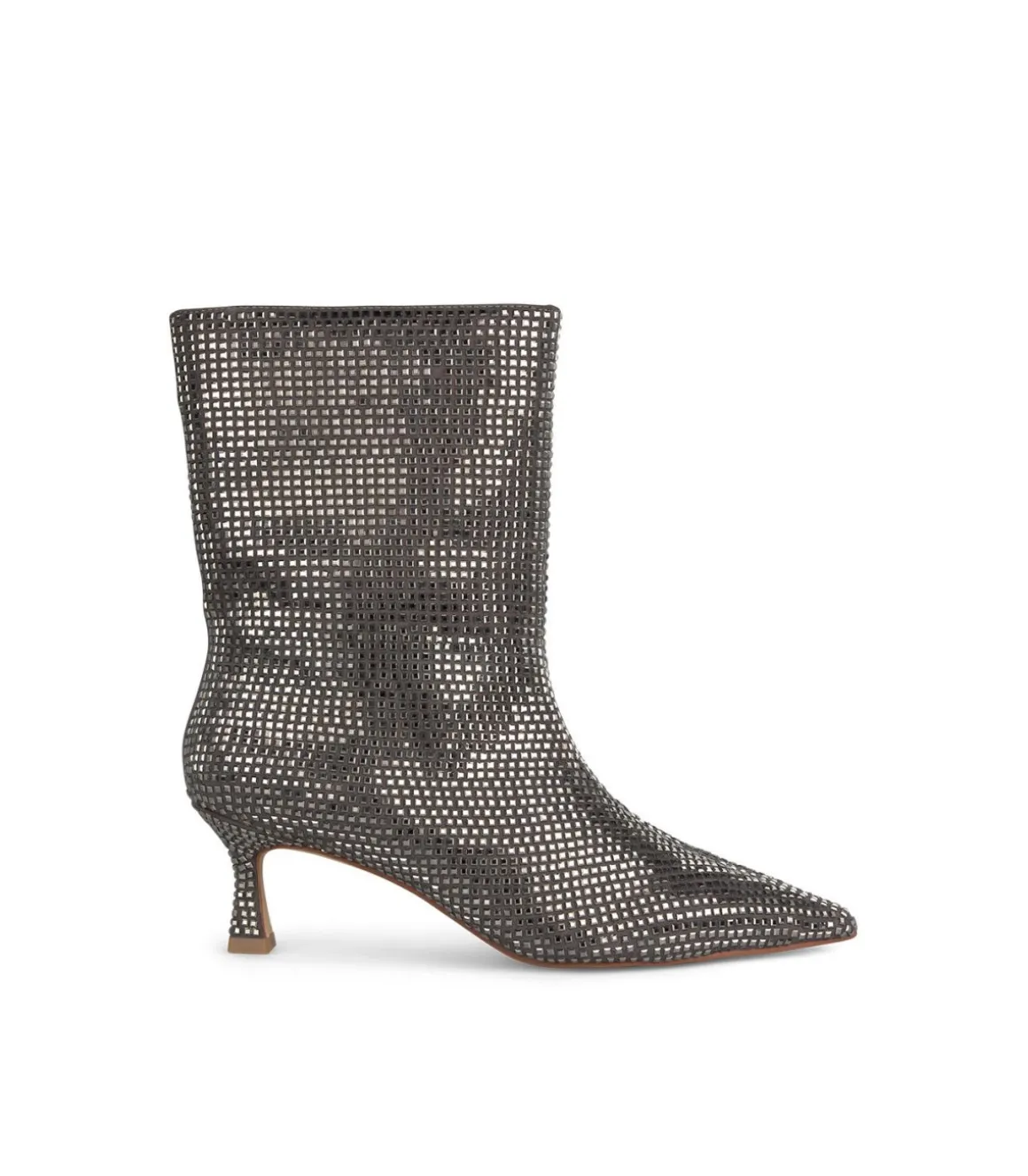 Botín de tacón para mujer con puntera afilada y cubierto de pedrería. La altura del tacón es de 7cm y la caña del b…