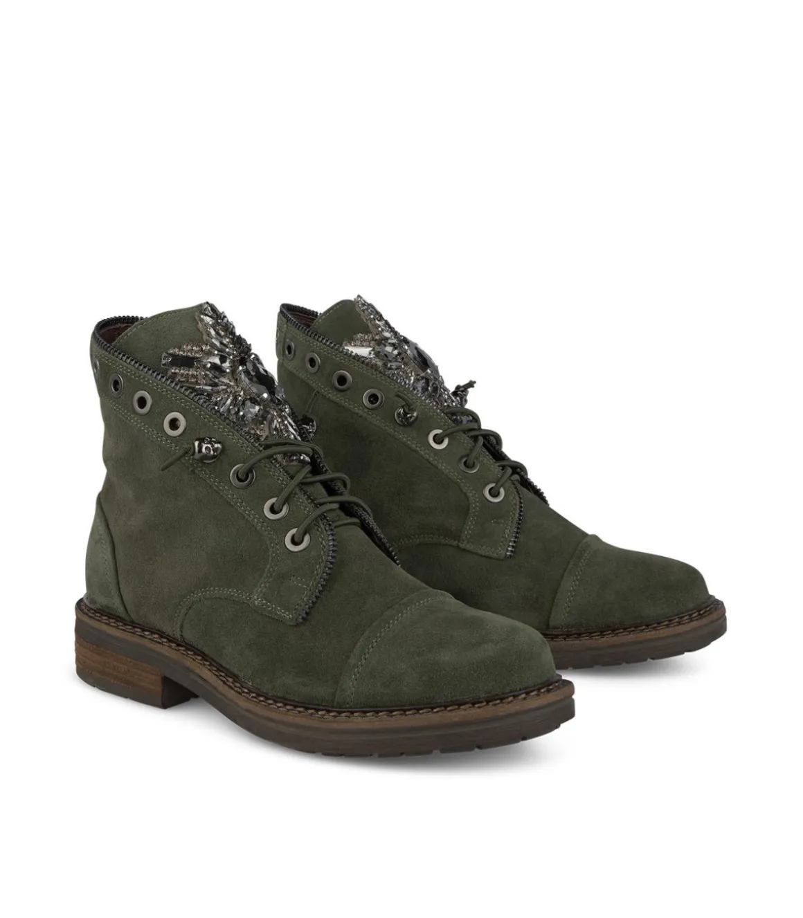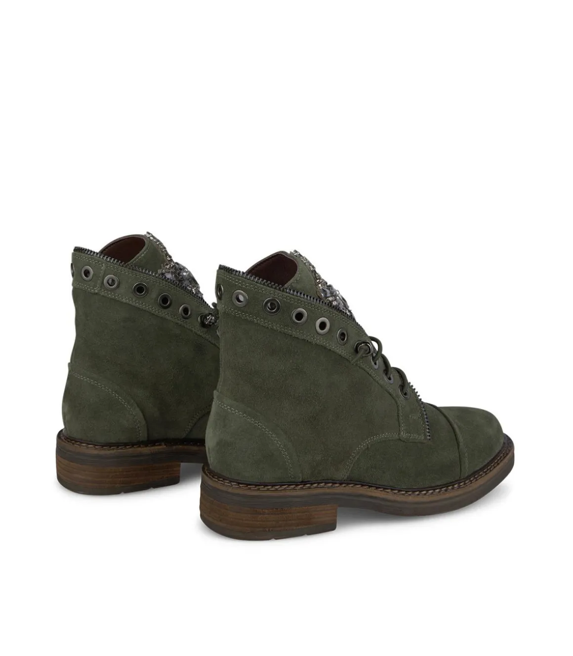 Botín de mujer realizado en piel. Detalles de pedrería en la lengüeta y detalle de cremallera en la parte superior de la caña. Cierre con cordones. La altura del tacón es de 3cm.