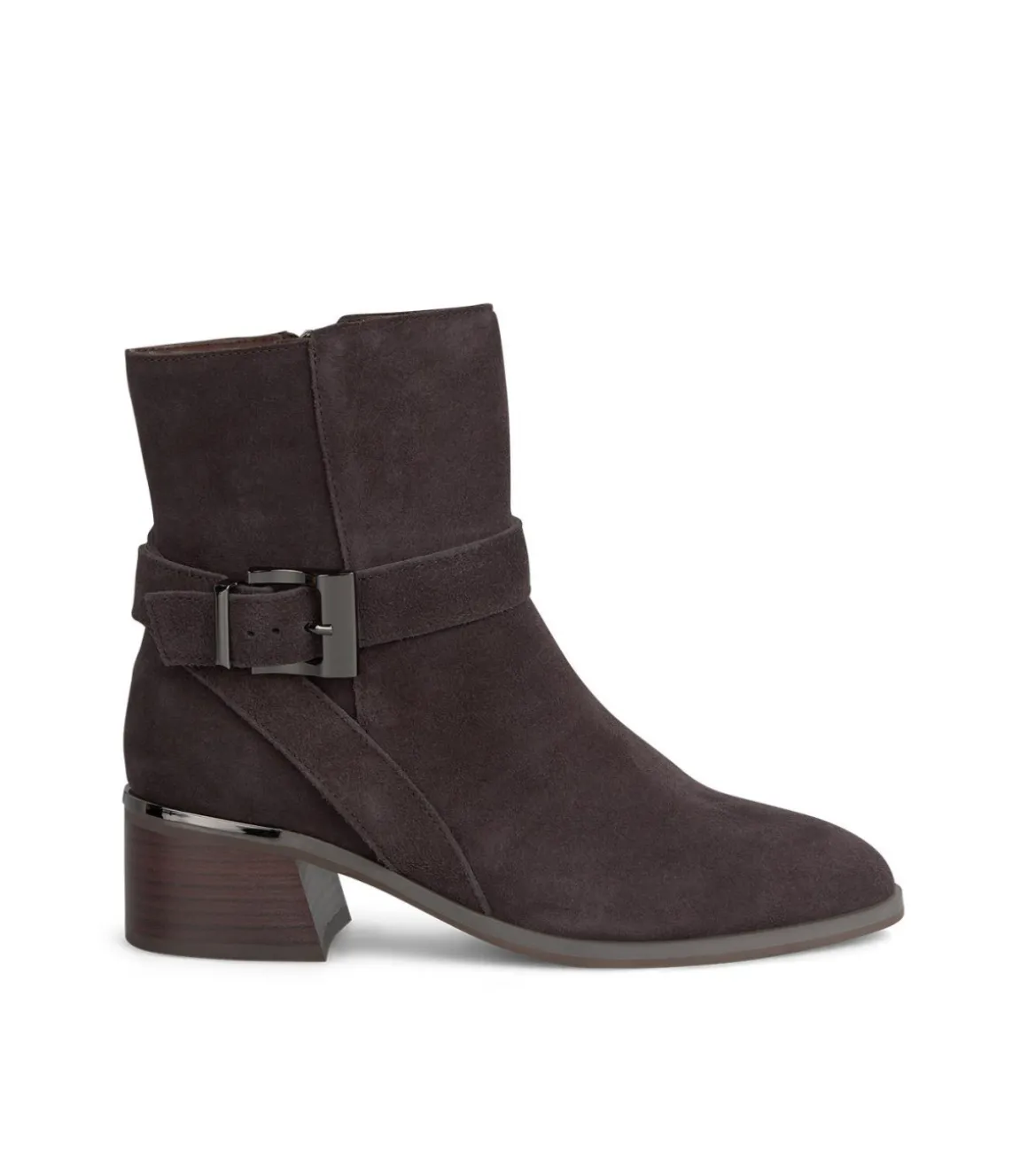 Botín plano de mujer con hebilla lateral. Confeccionado en piel. La altura del tacón es de 5,5cm y la altura de la caña es de 18cm.