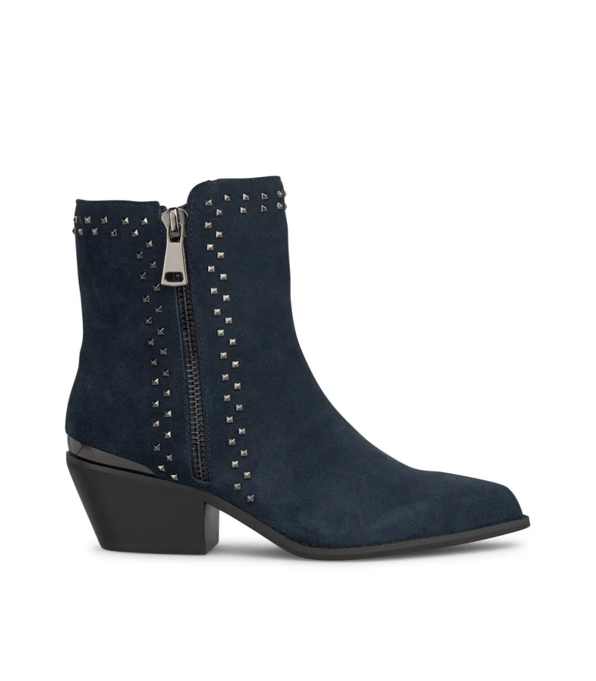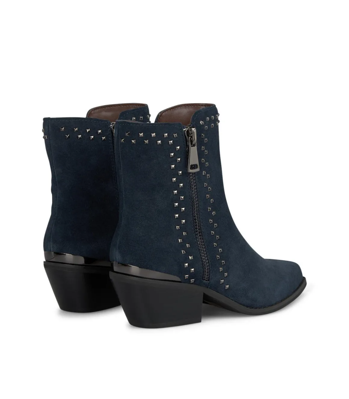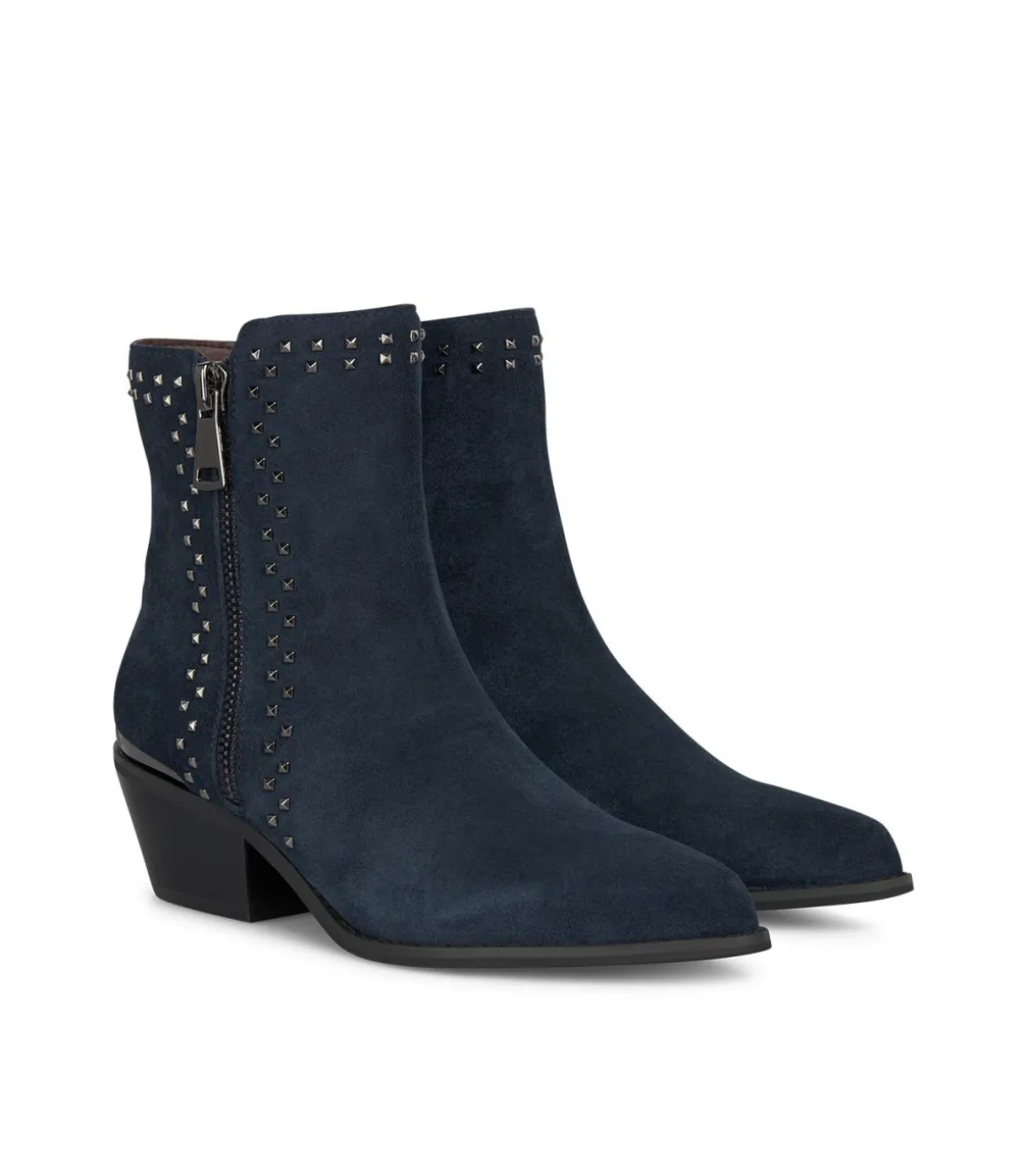 Botín plano de mujer con cremallera lateral y tachas. La altura del tacón es de 5,2cm y la altura de la caña es de 15cm.