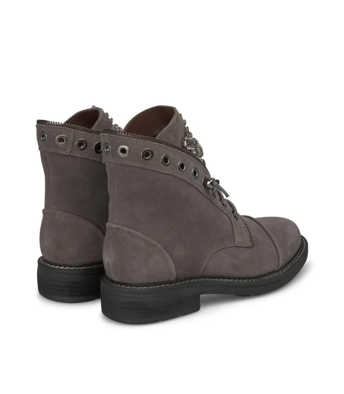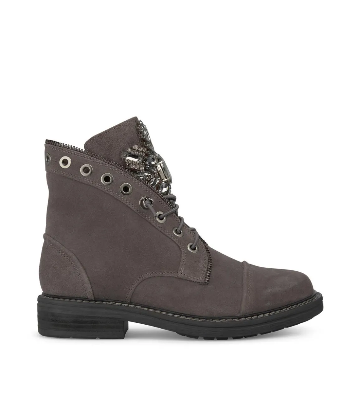 Botín plano de mujer con cordones y detalle de pedrería en la lengüeta. Puntera redondeada y cierre con cordones. La altura del tacón es de 3,5cm y la altura de la caña es de 14,5cm.