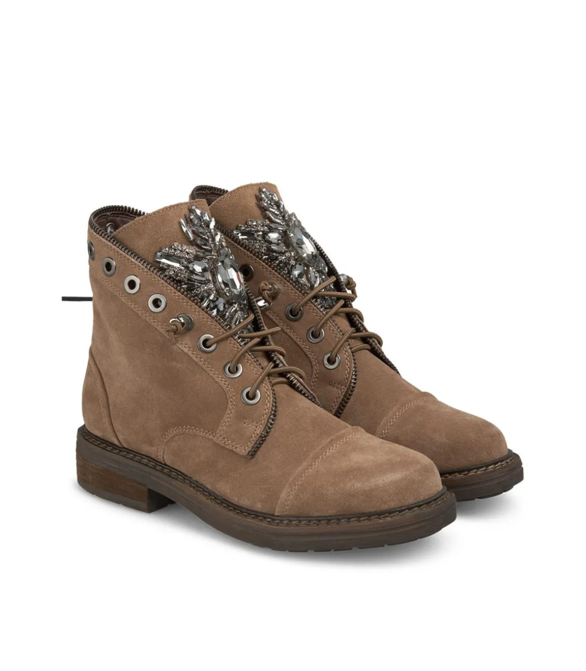 Botín plano de mujer con cordones y detalle de pedrería en la lengüeta. Puntera redondeada y cierre con cordones. La altura del tacón es de 3,5cm y la altura de la caña es de 14,5cm.