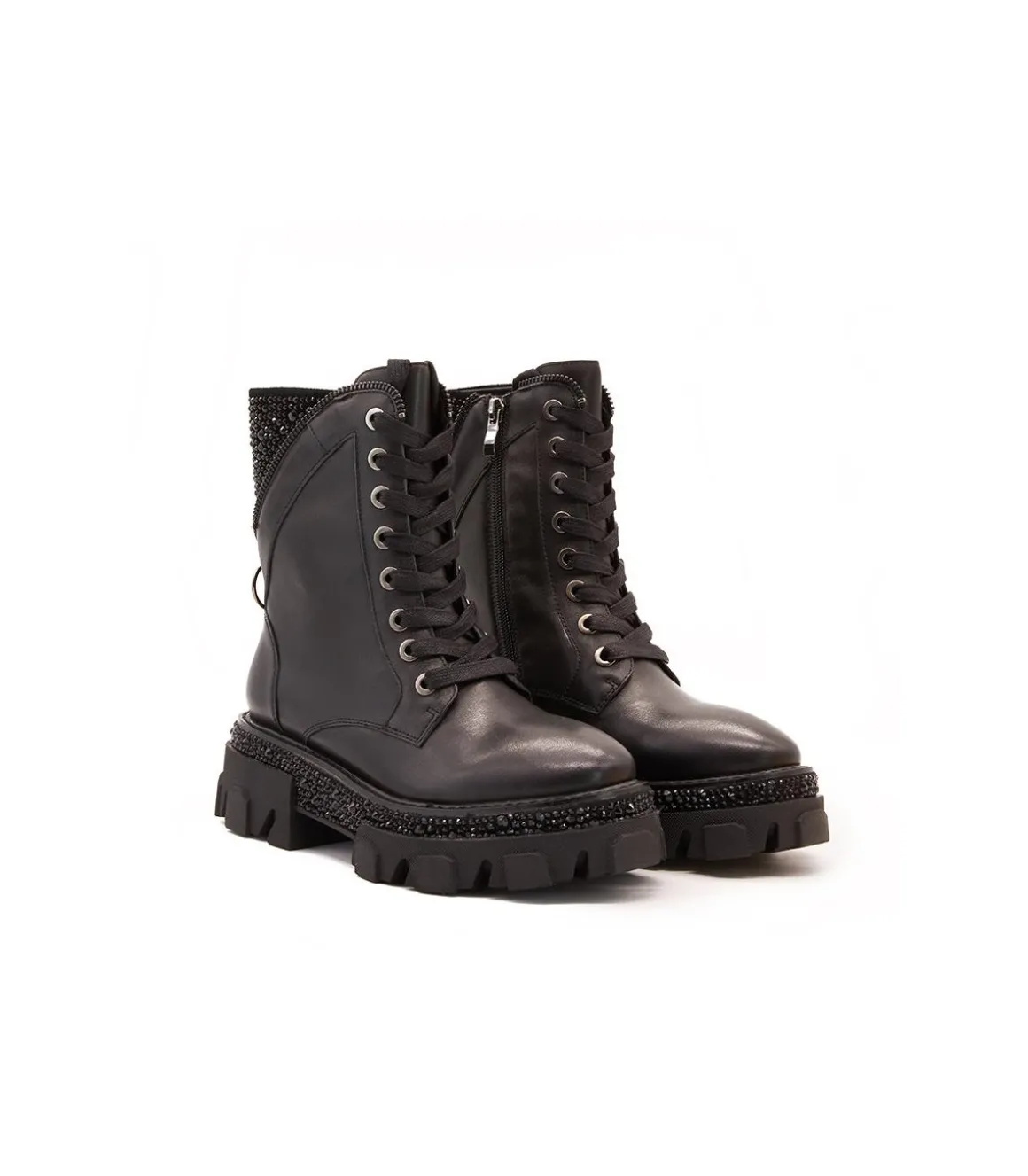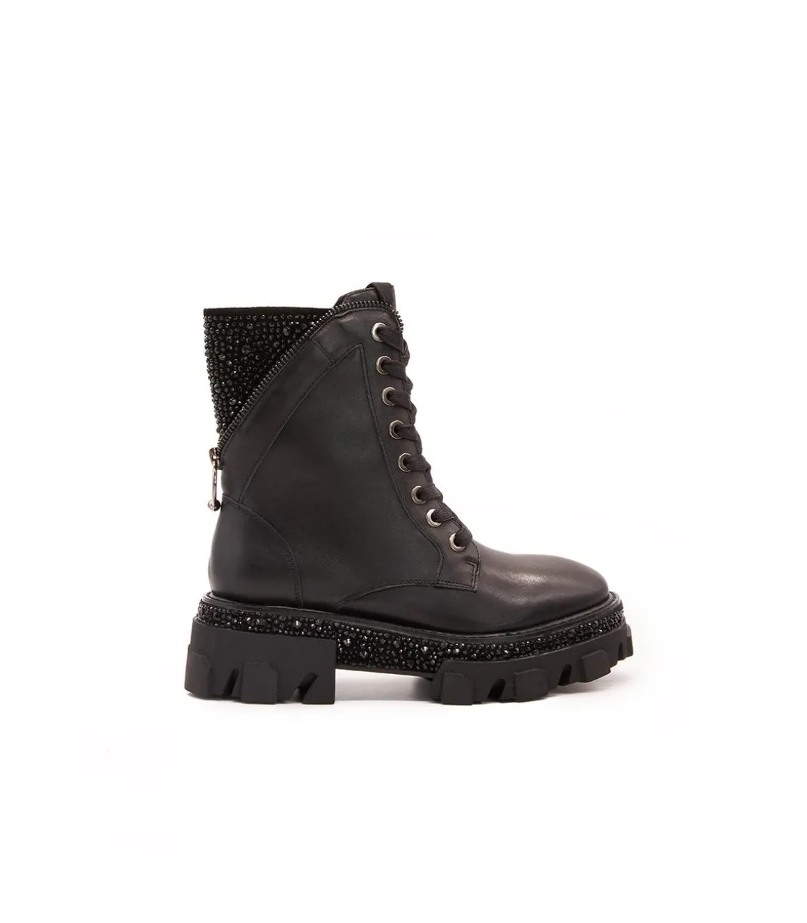 Botín plano realizado en piel. Detalle de pedrería en la suela y cremallera. Cierre con cremallera. Suela tipo track. La altura del tacón es de 5cm.