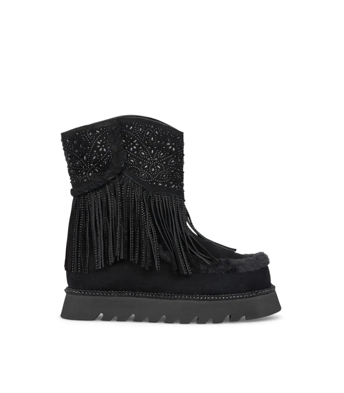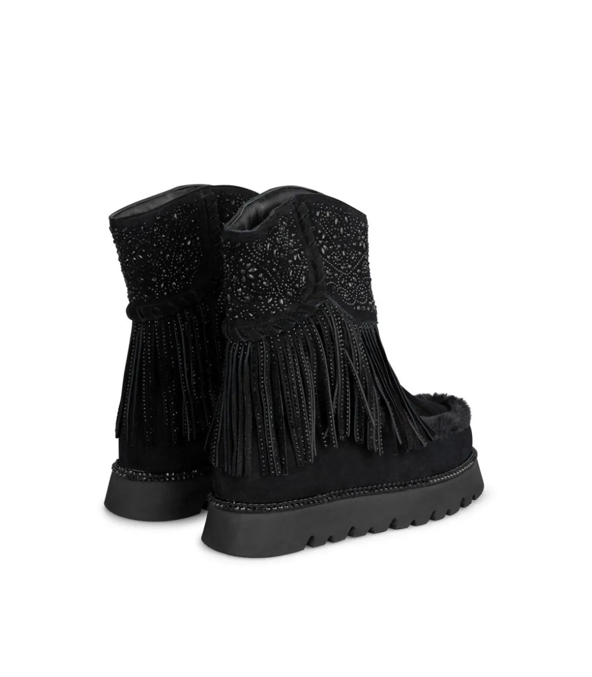 Botín plano de mujer con flecos y detalles. La altura del tacón es de 3,8cm y la altura de la caña es de 20cm.