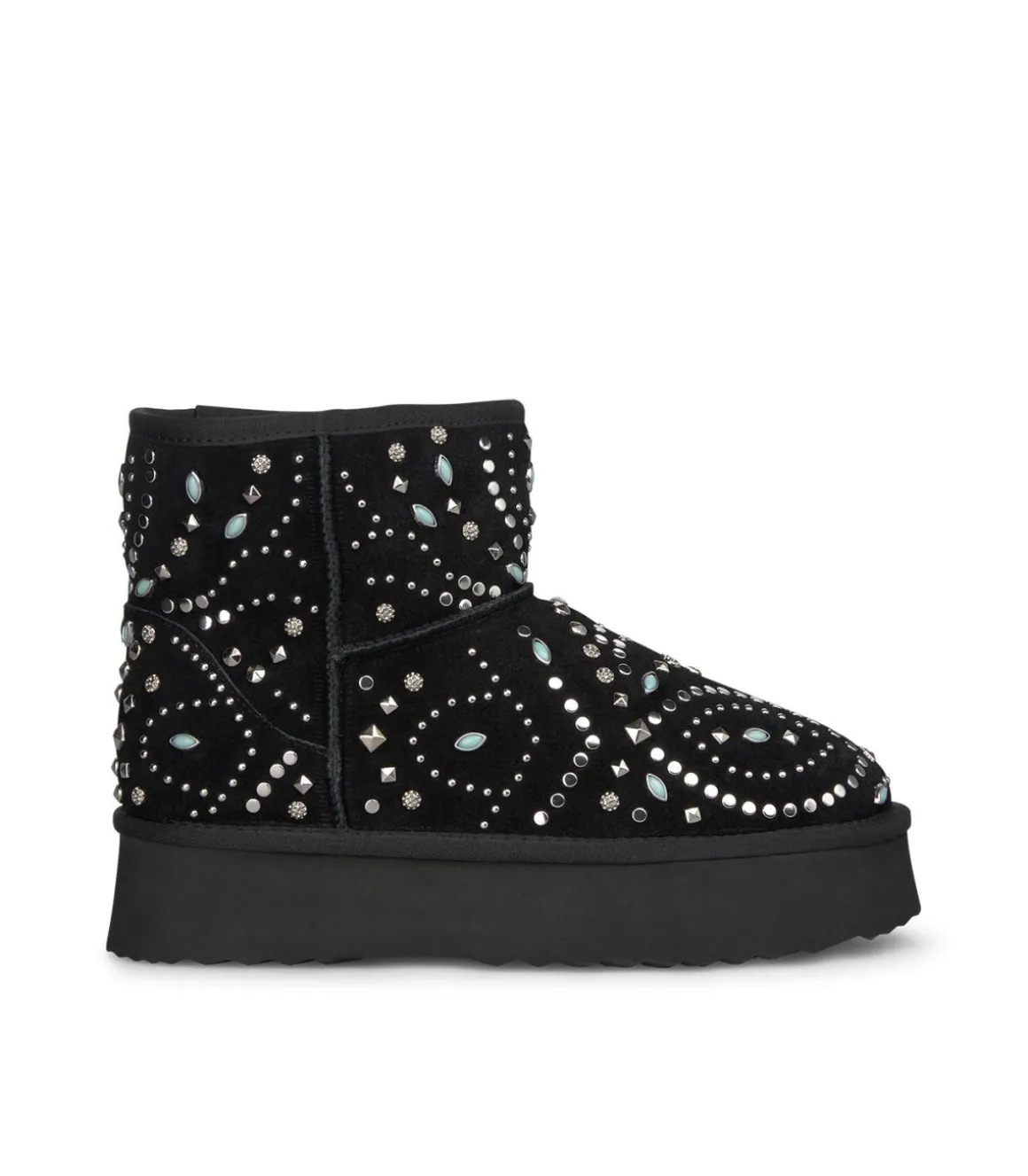 Botín plano de mujer con pelo realizado en piel cubierta de tachas. La altura del tacón es de 3,8cm y la altura de la caña es de 14cm.