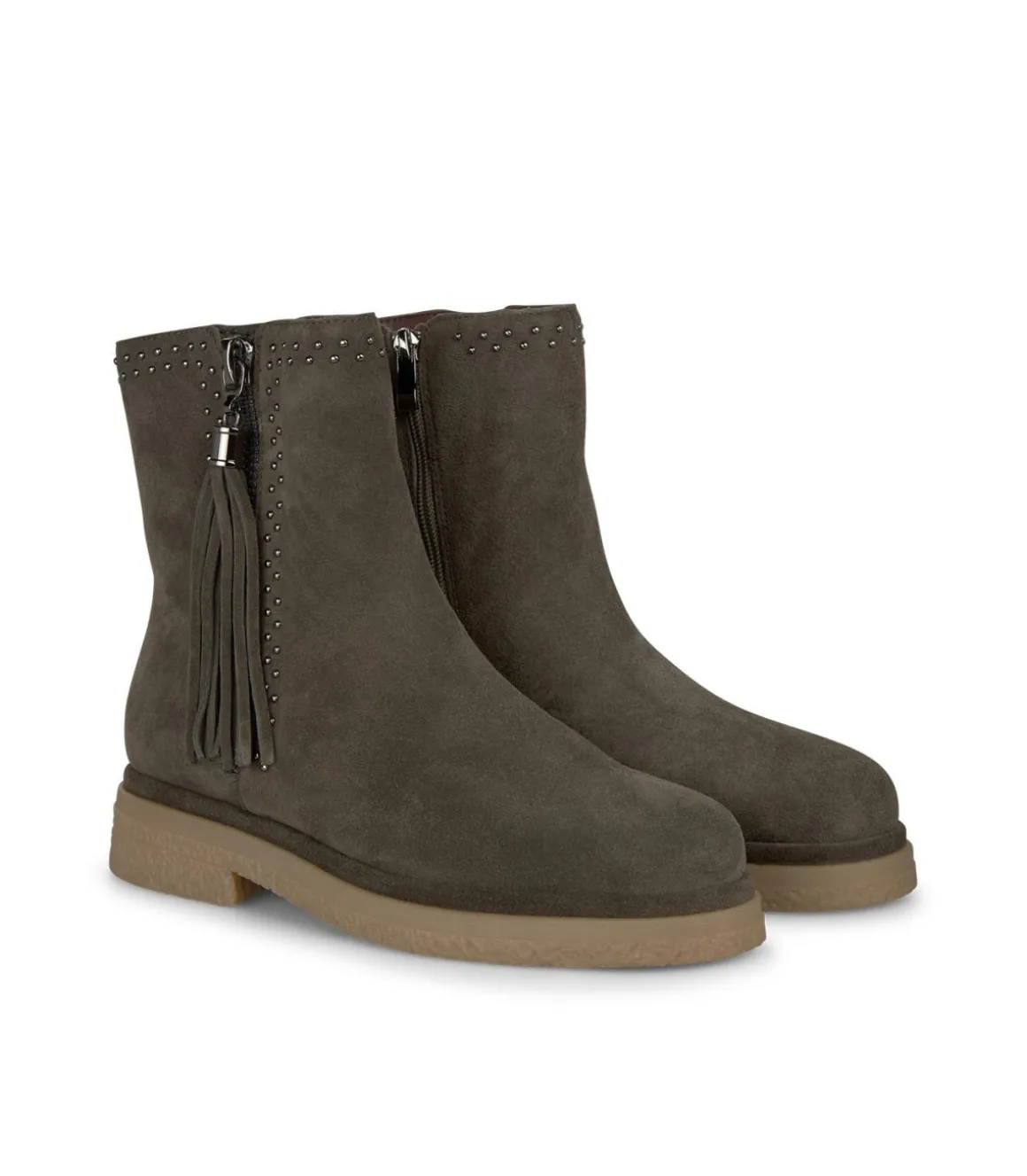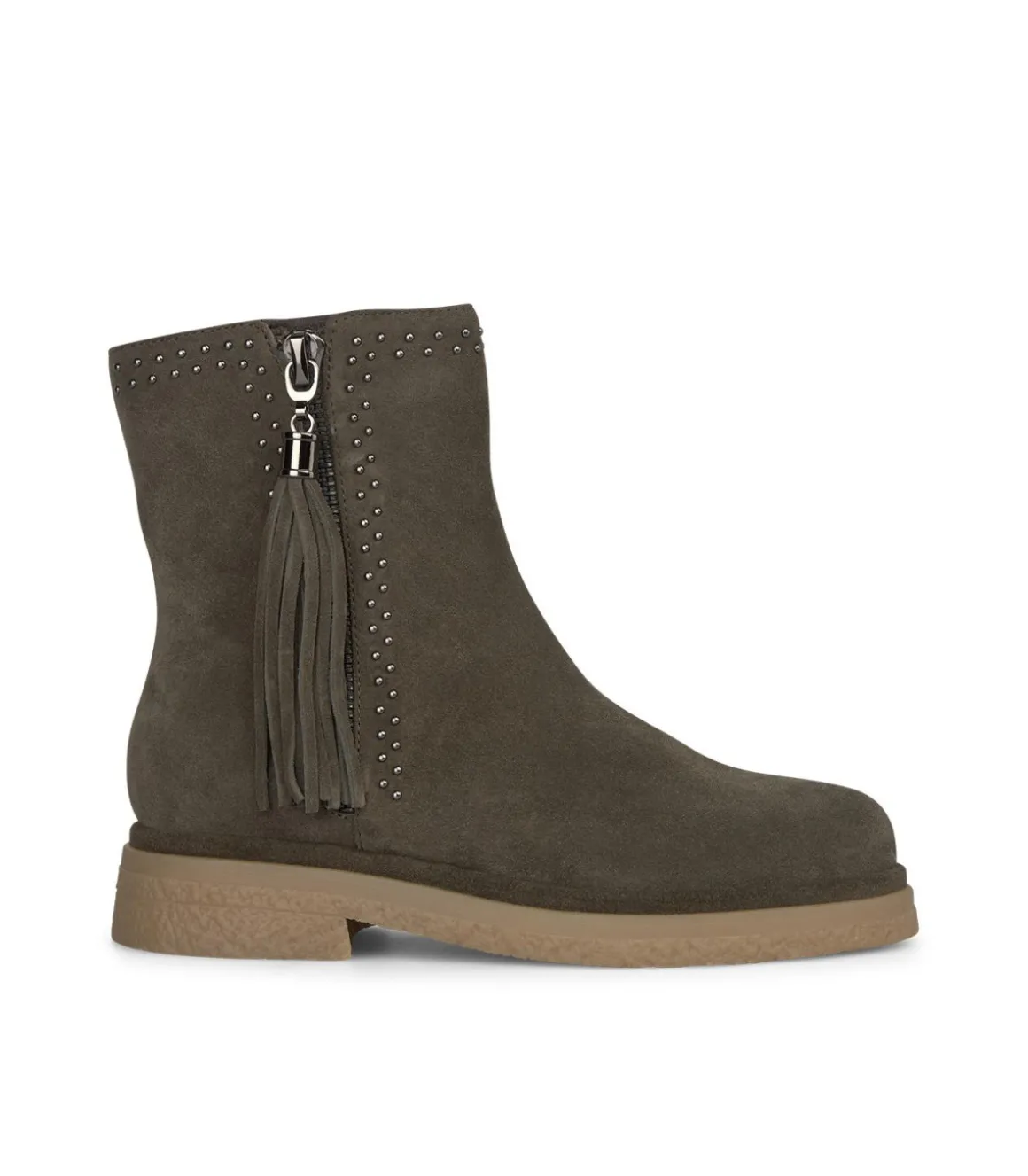 Botín plano de mujer con cremallera lateral y hebilla colgante. Confeccionado en piel con tachas alrededor de la cremal…