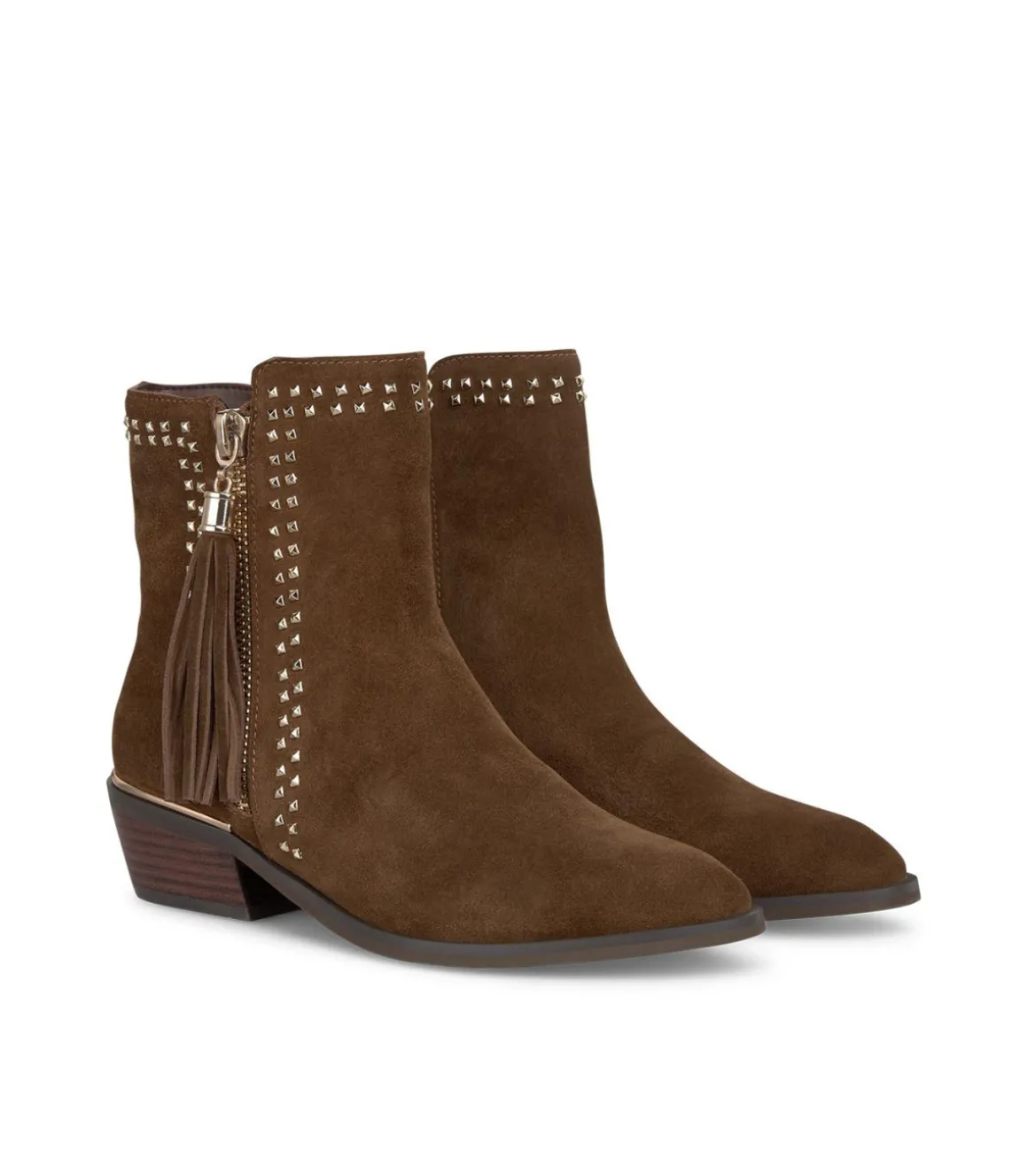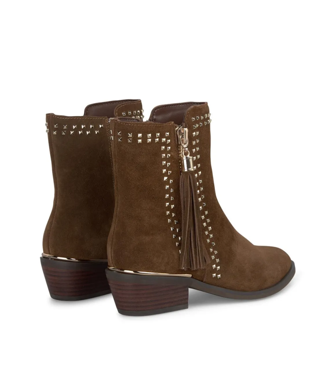 Botín plano de mujer con cremallera lateral y tachas. De la cremallera cuelga una borla. Realizado en piel. La altura del tacón es de 5cm y la altura de la caña es de 15cm.