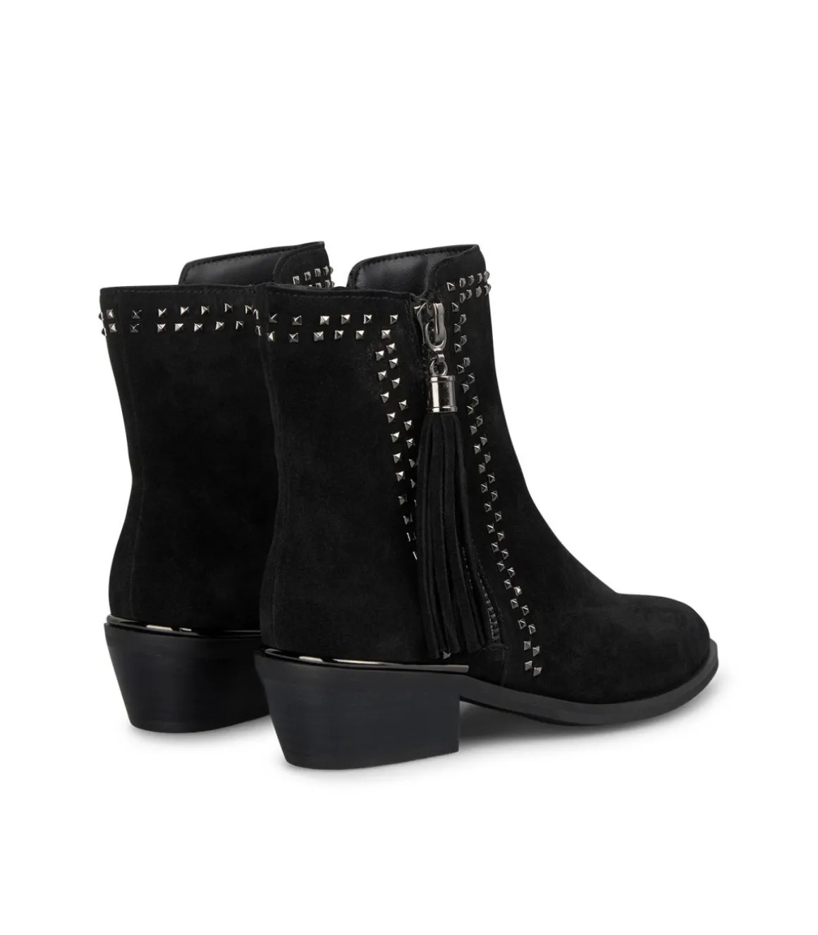 Botín plano de mujer con cremallera lateral y tachas. De la cremallera cuelga una borla. Realizado en piel. La altura d…