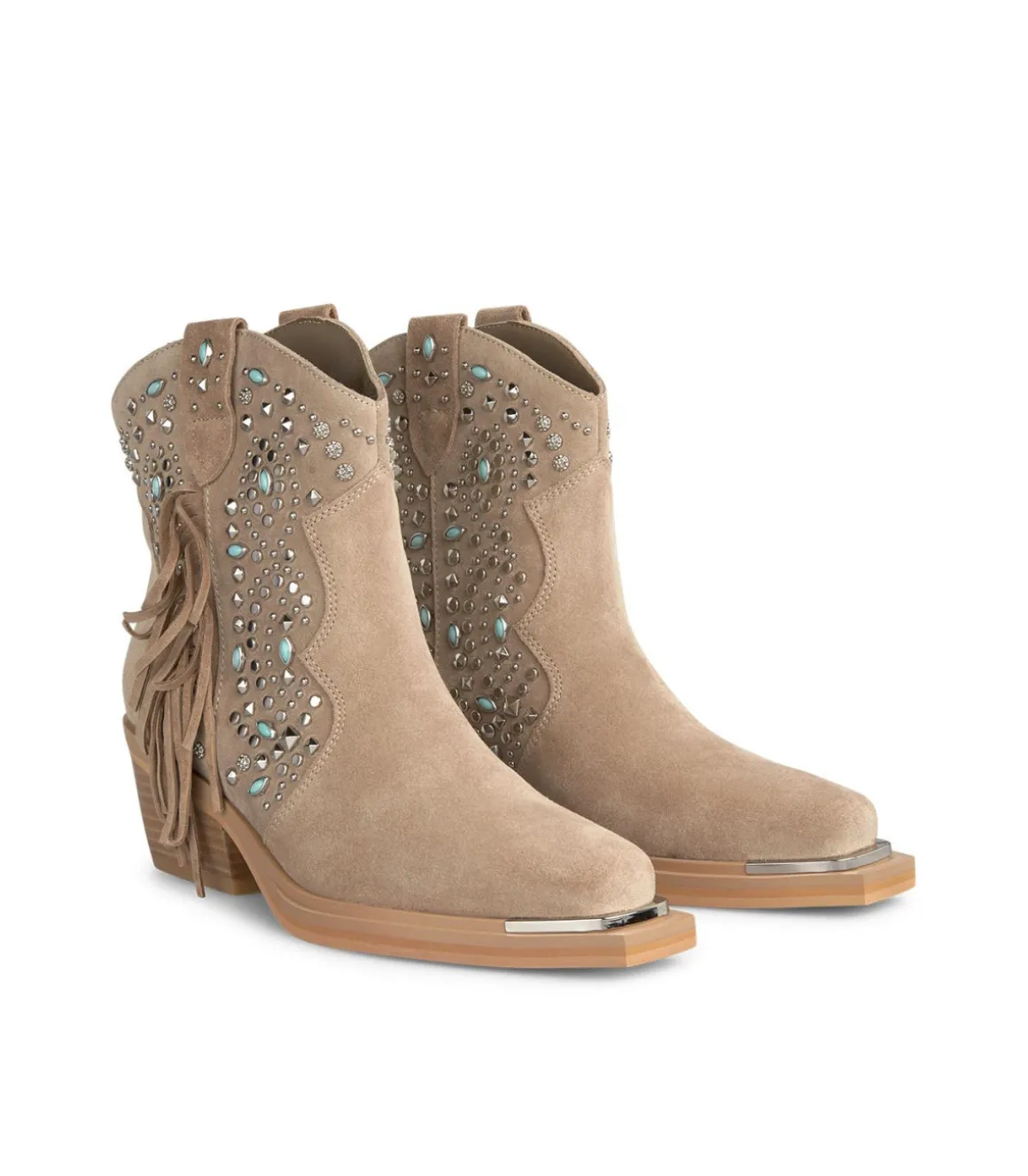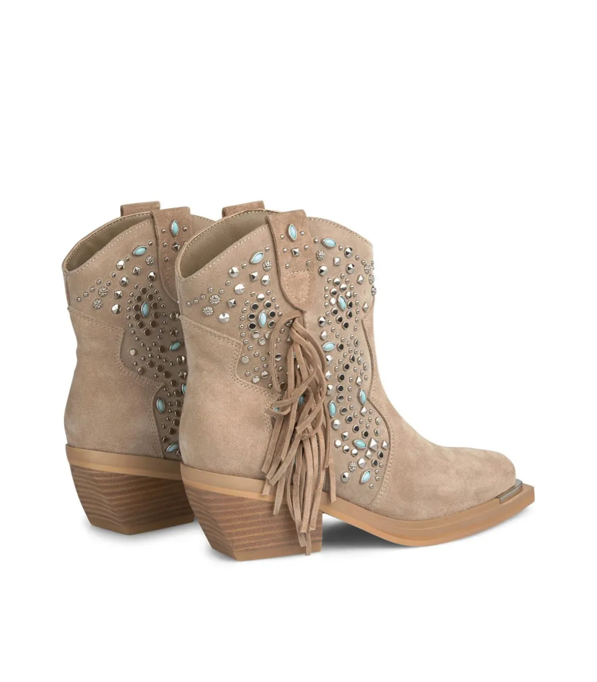 Botín de mujer con detalle de tachas y flecos en la caña, realizado en piel. Sin cierre y puntera redondeada. La altura del tacón es de 6 cm y la altura de la caña es de 13 cm.