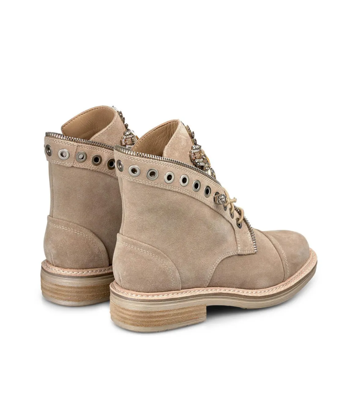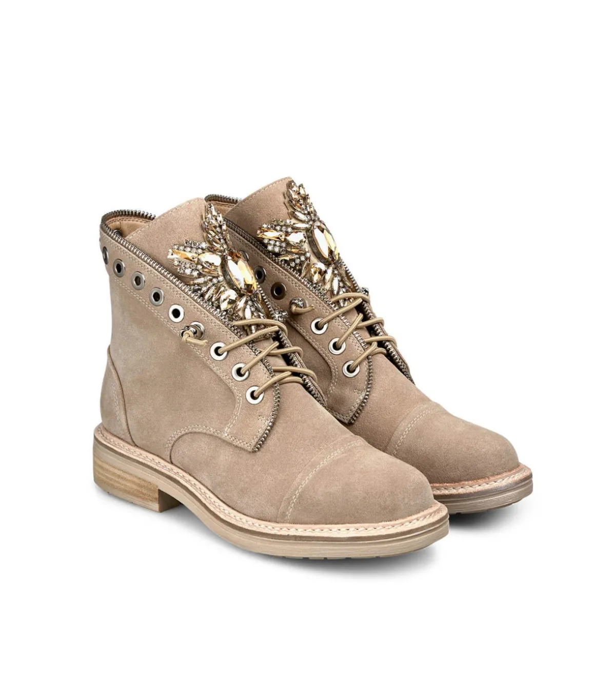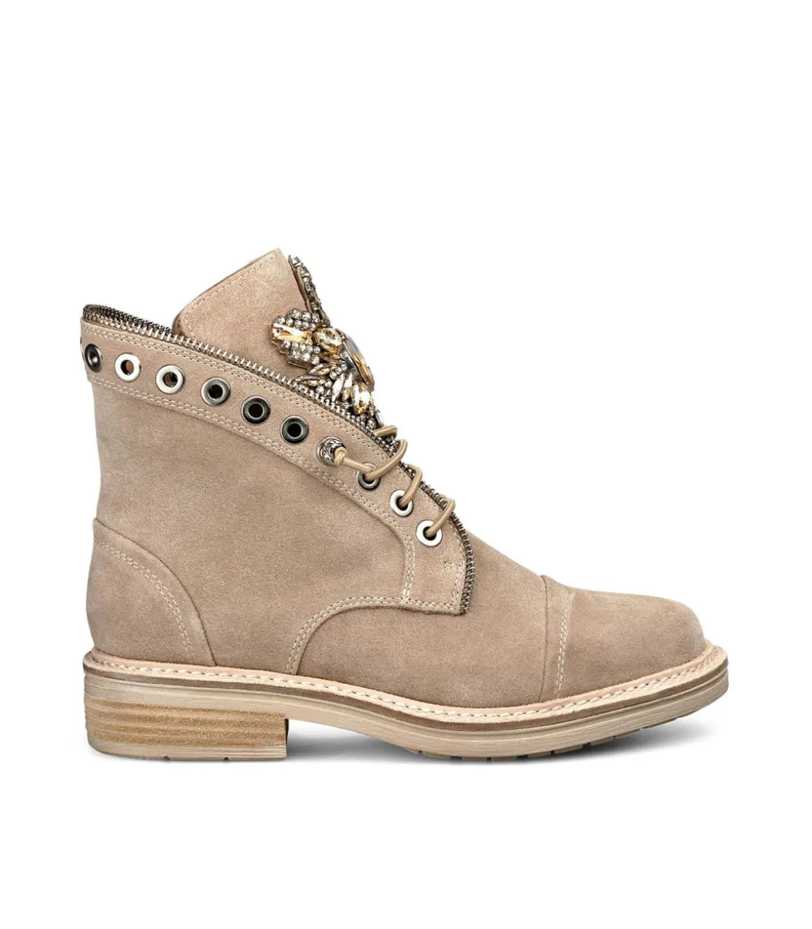 Botín de mujer plano realizado en piel con detalle de pedrería en la lengüeta. Cierre con cordones. La altura de la caña es de 13cm y la altura del tacón es de 3cm.