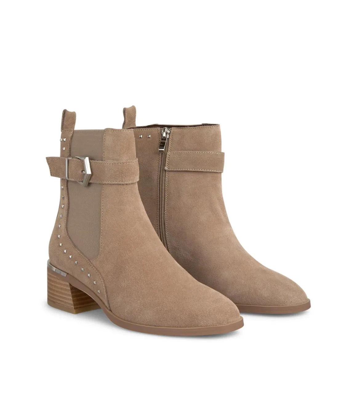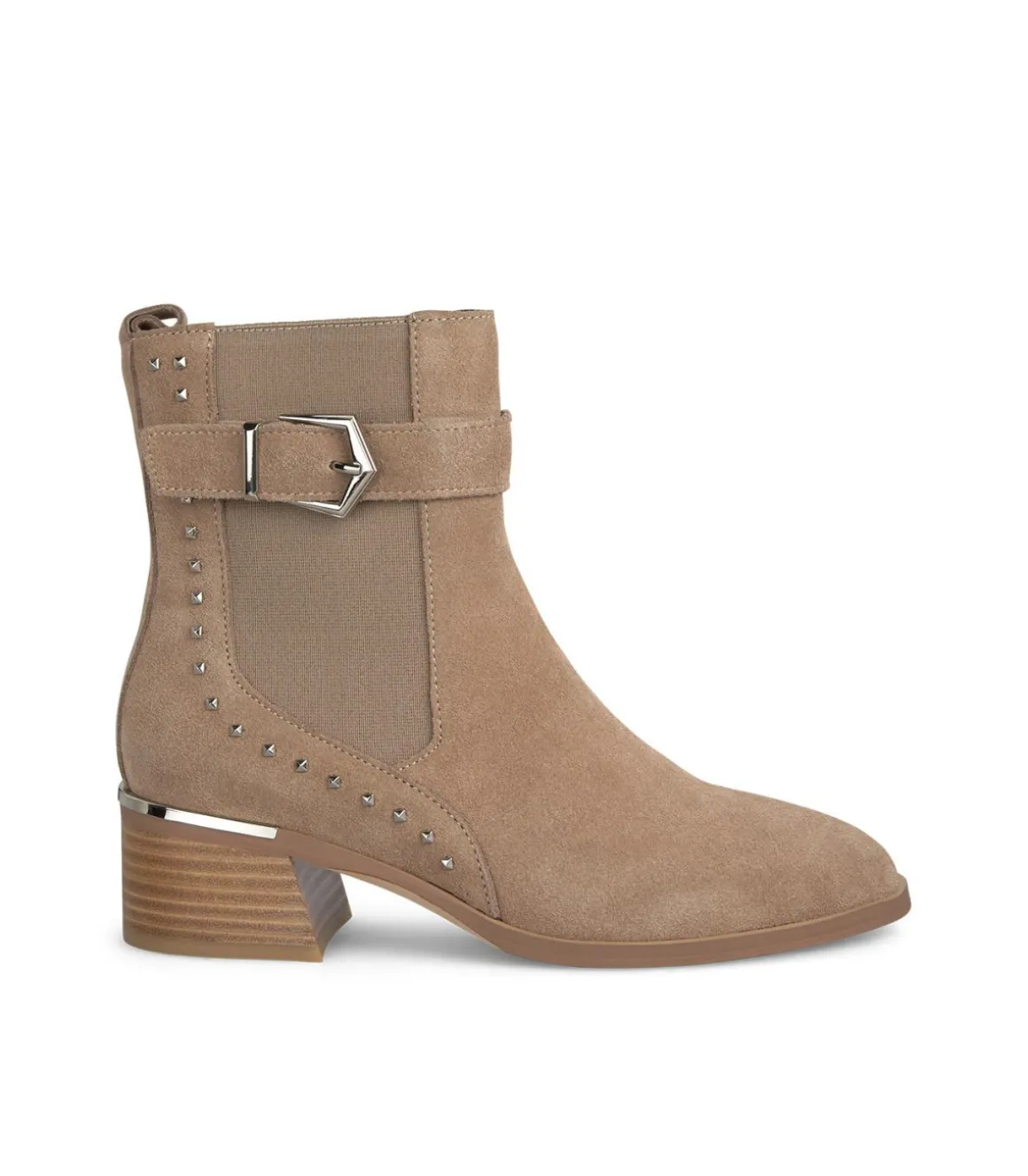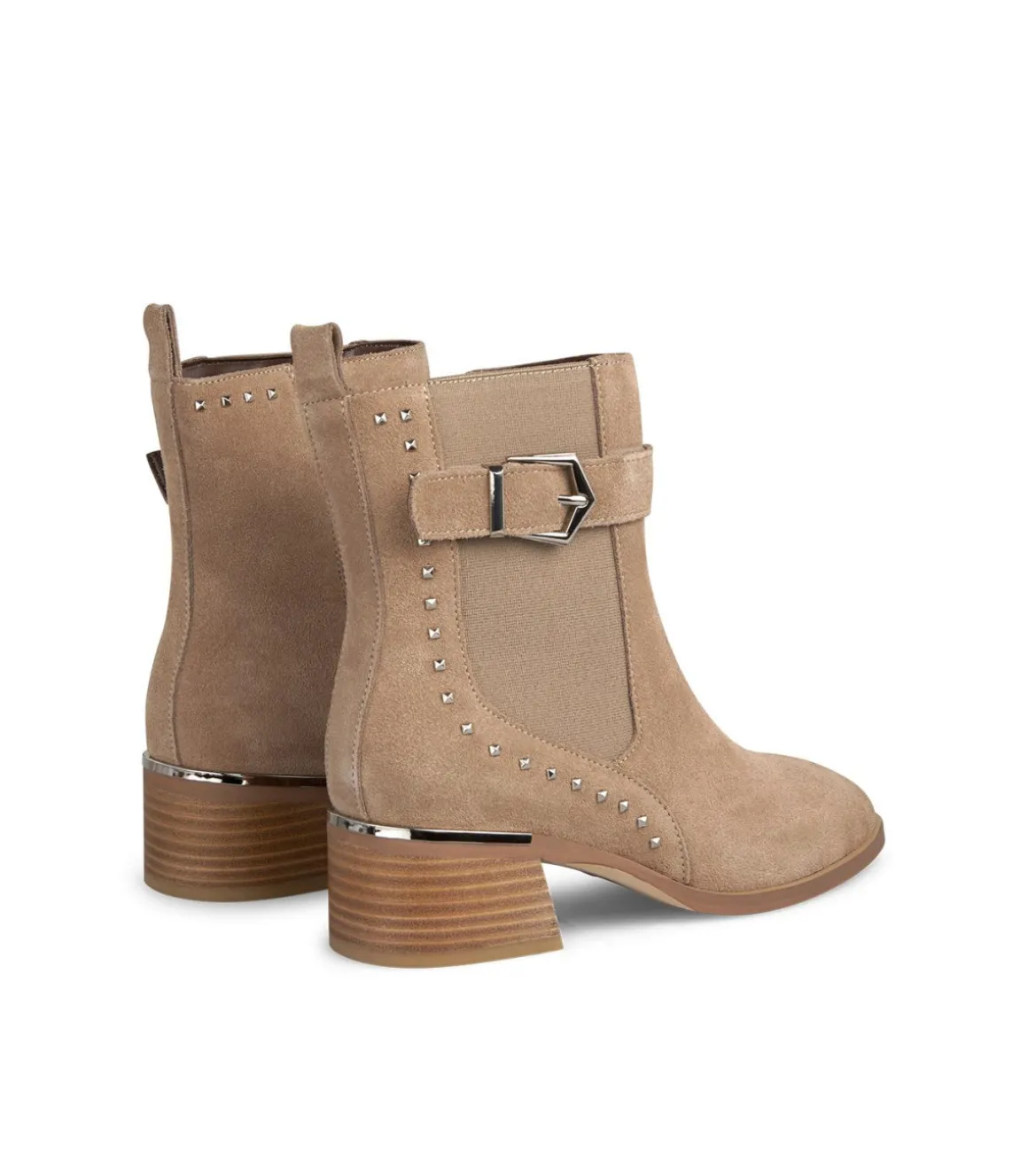 Botín plano de mujer con hebilla lateral y detalle de tachas. La altura del tacón es de 5,5cm y la altura de la caña es de 16,5cm.