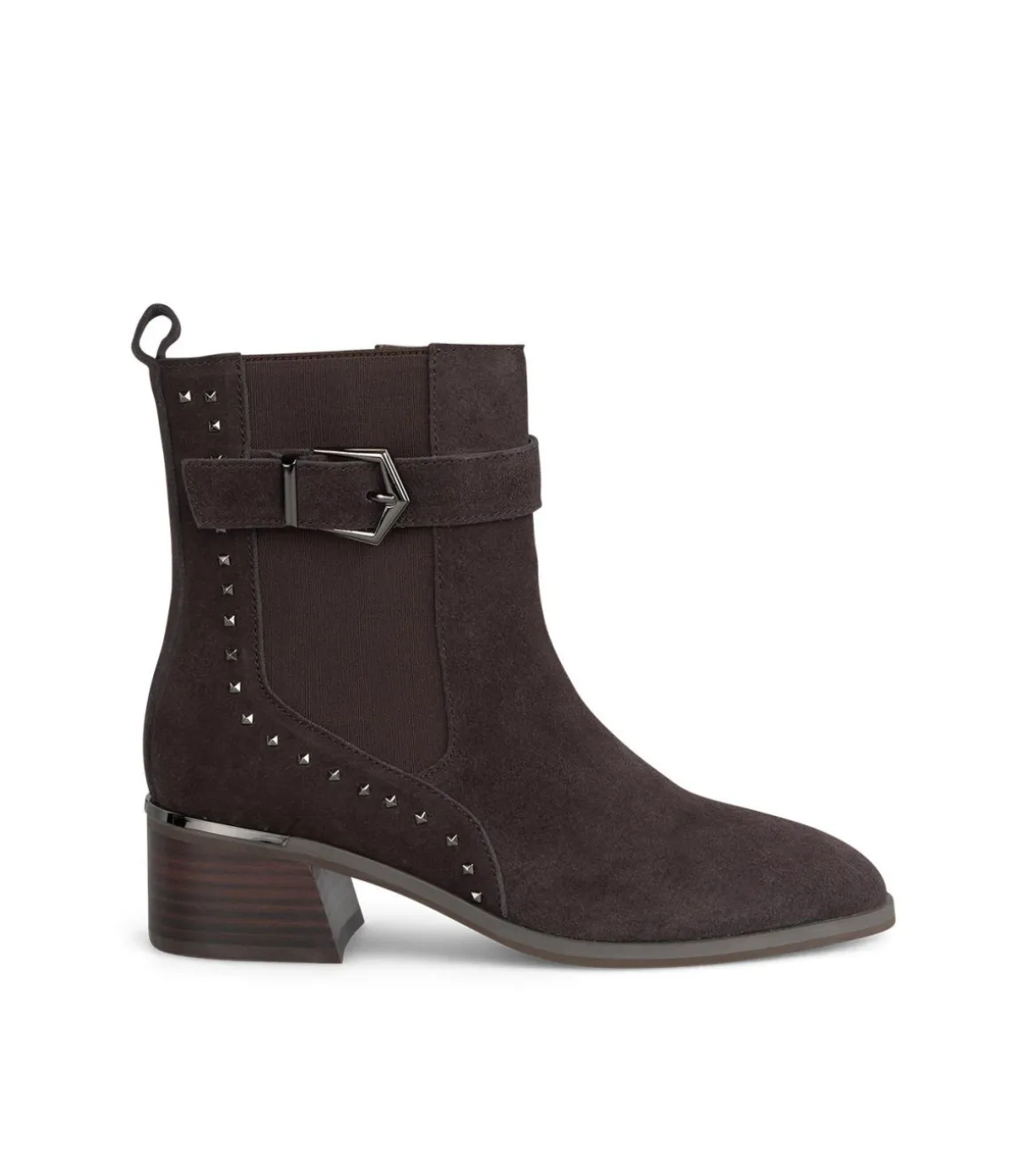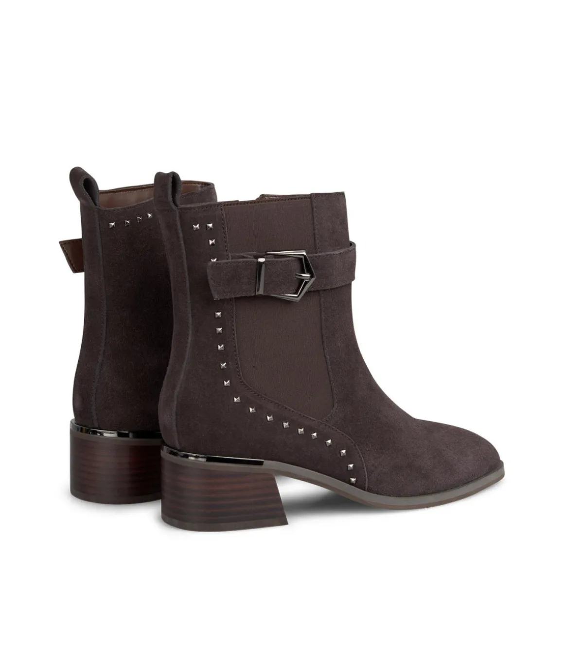 Botín plano de mujer con hebilla lateral y detalle de tachas. La altura del tacón es de 5,5cm y la altura de la caña es de 16,5cm.