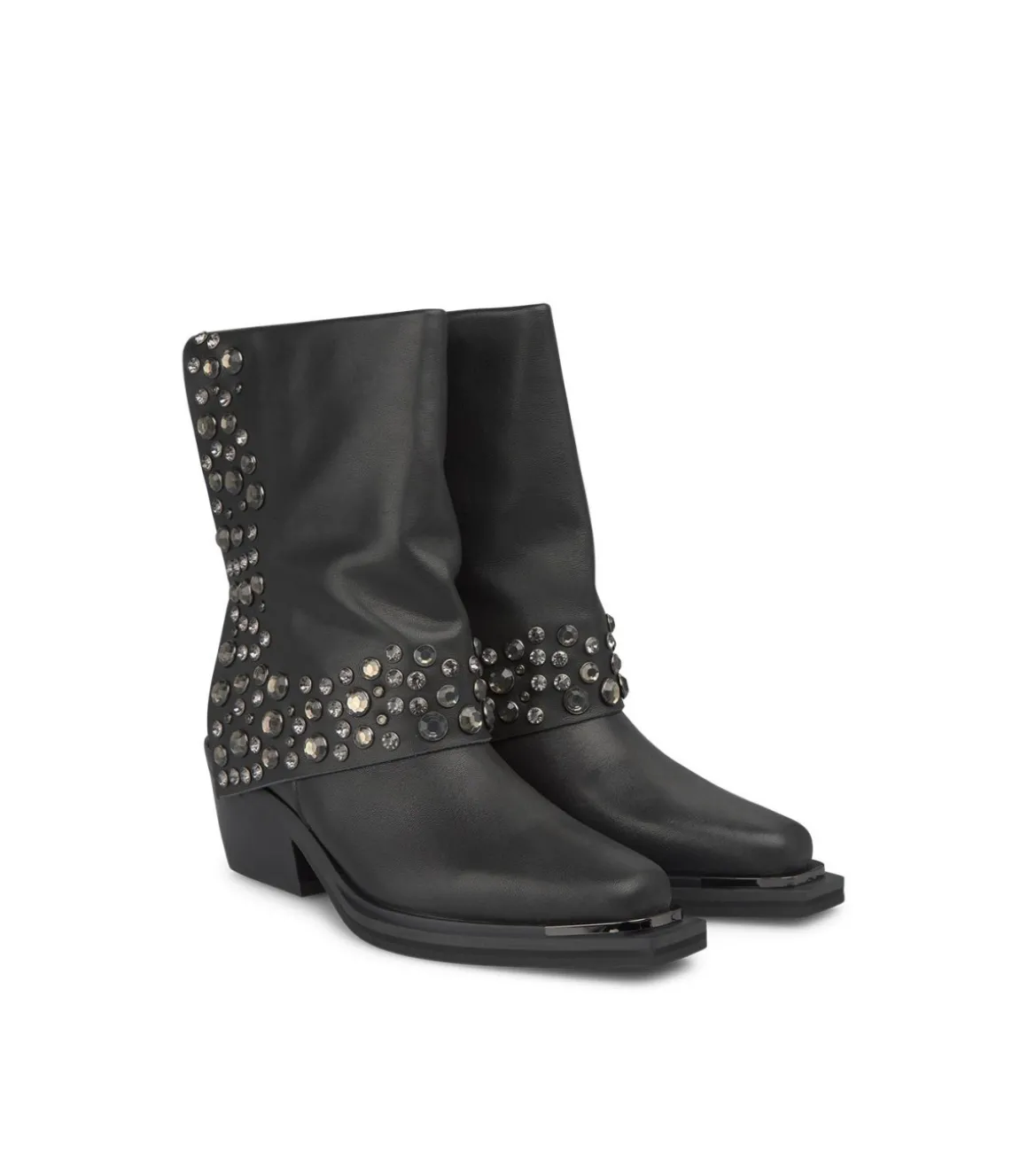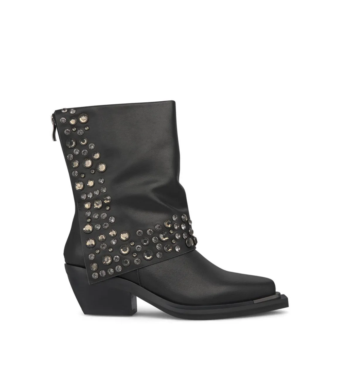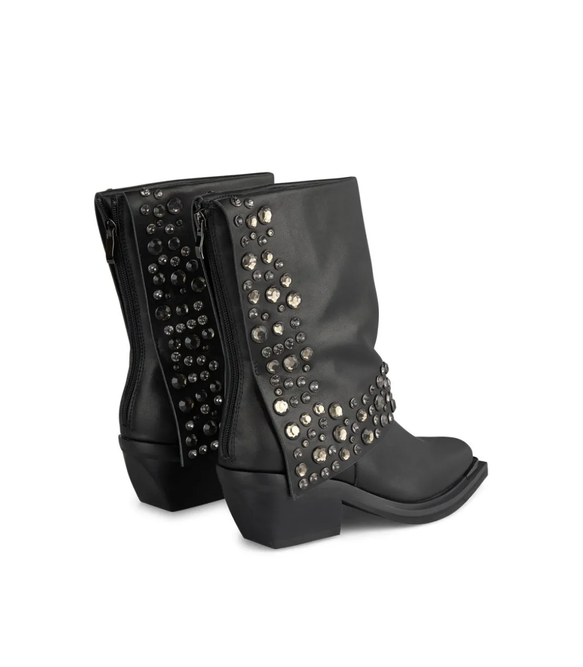 Botín de mujer con caña plegada y tachas en el pliegue, realizado en piel. Cierre con cremallera en la parte trasera y…