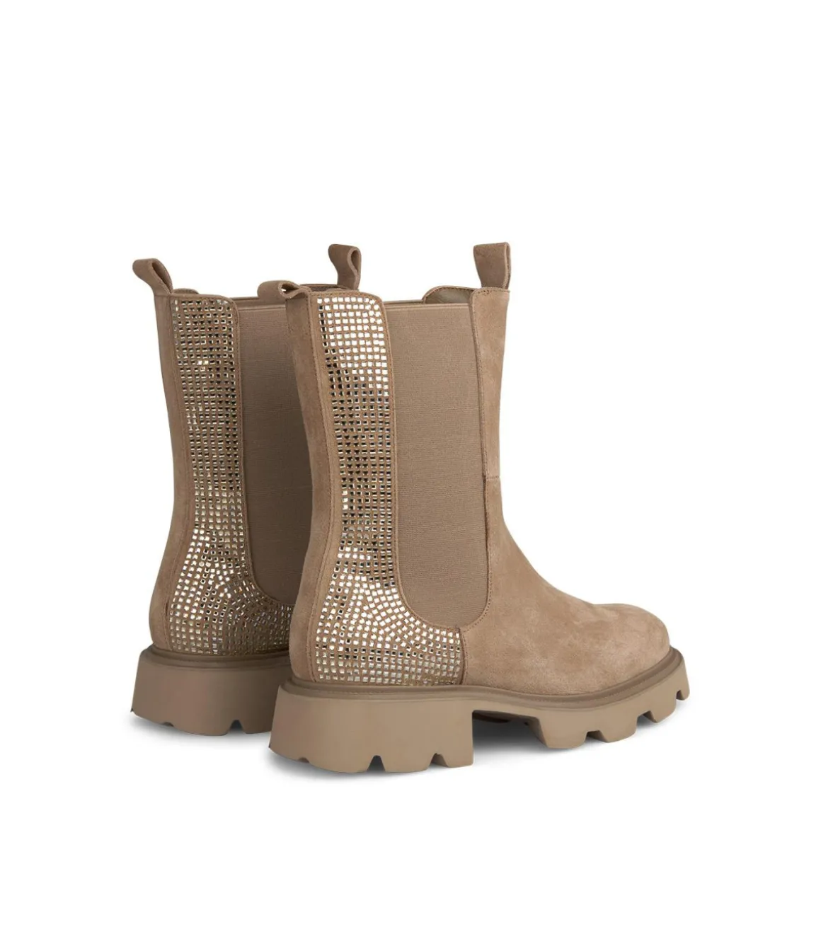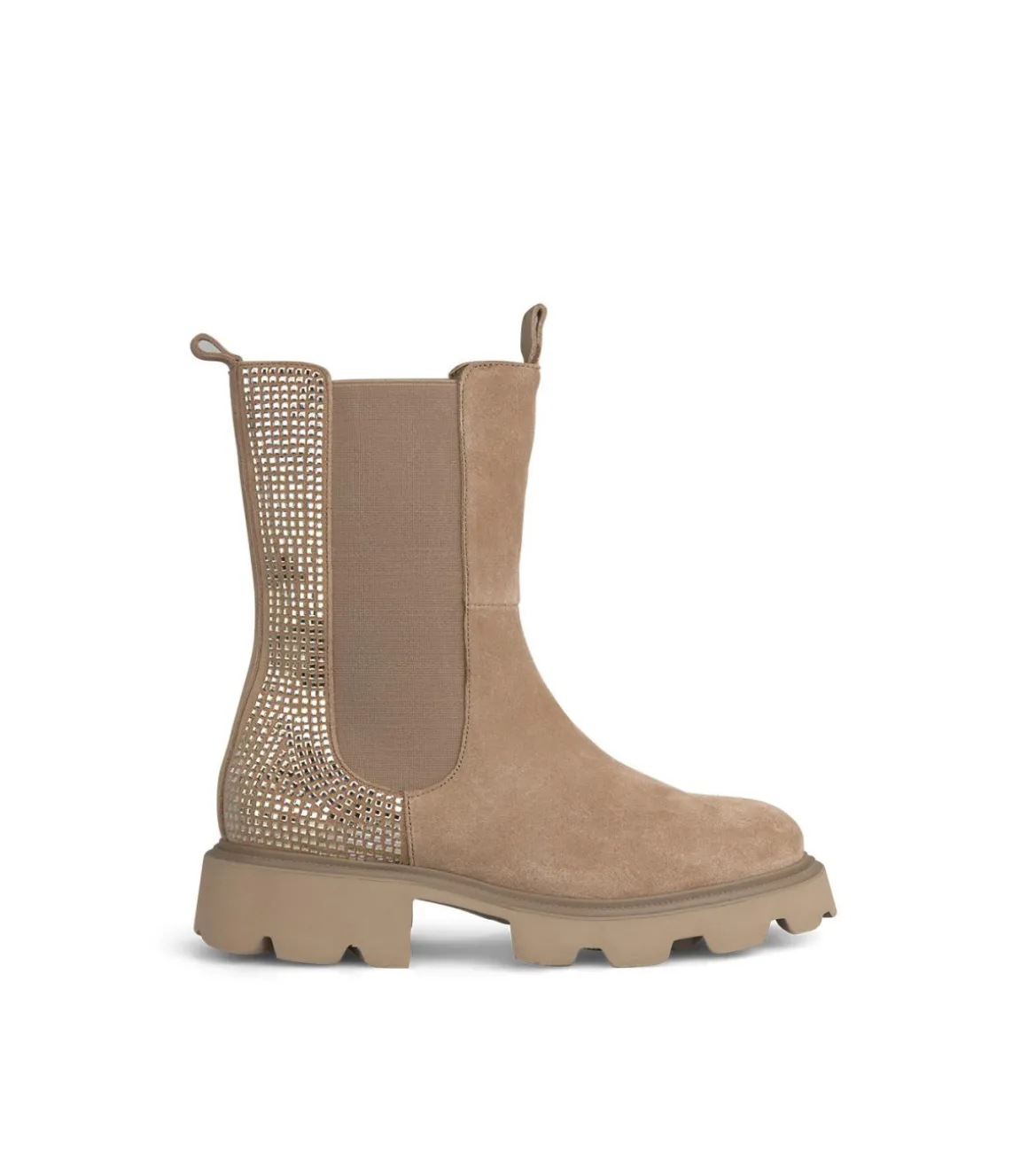 Botín de mujer con suela track. Con puntera redondeada y sin cierre. La altura del tacón es de 4,3cm y la caña de la bota mide 19cm.