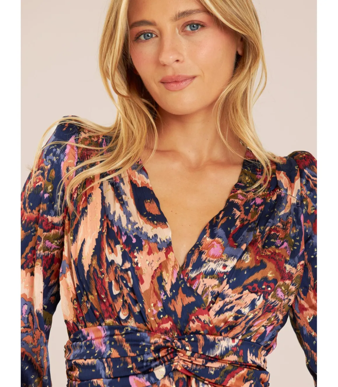 Blusa estampada con frunces de mujer. Escote en pico y manga larga. Cierre frontal con cremallera trasera, confeccionada en poliéster. Medidas de la modelo: altura 1,69cm, pecho 82cm, cintura 60cm y cadera 88cm.