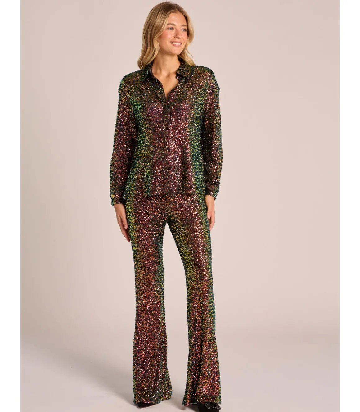 Camisa cubierta de pedrería. Cuello de solapa con escote en pico y manga larga. Cierre frontal con botones. Medidas de la modelo: altura 1,69cm, pecho 82cm, cintura 60cm y cadera 88cm.