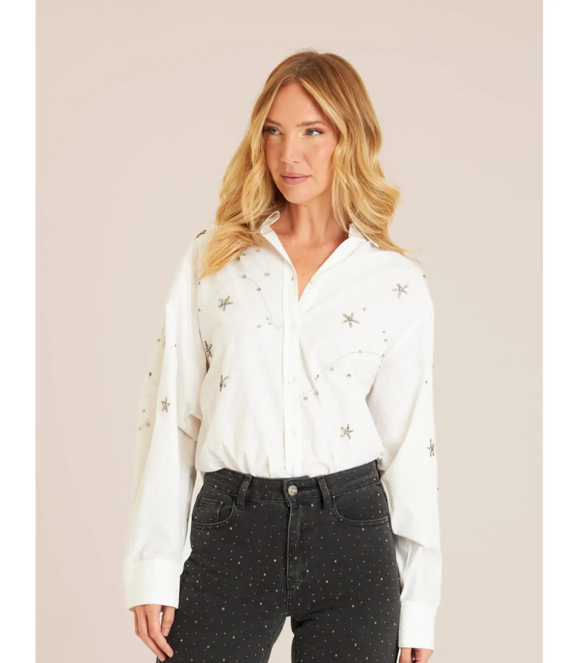 Camisa con detalles de pedrería de mujer. Cuello de solapa con escote en pico y manga larga. Cierre frontal con botones, confeccionada en algodón. Medidas de la modelo: altura 1,69cm, pecho 82cm, cintura 60cm y cadera 88cm.
