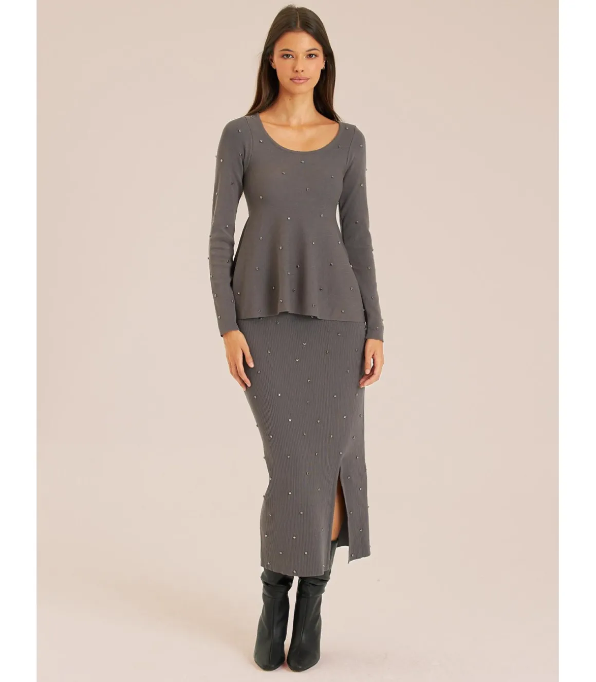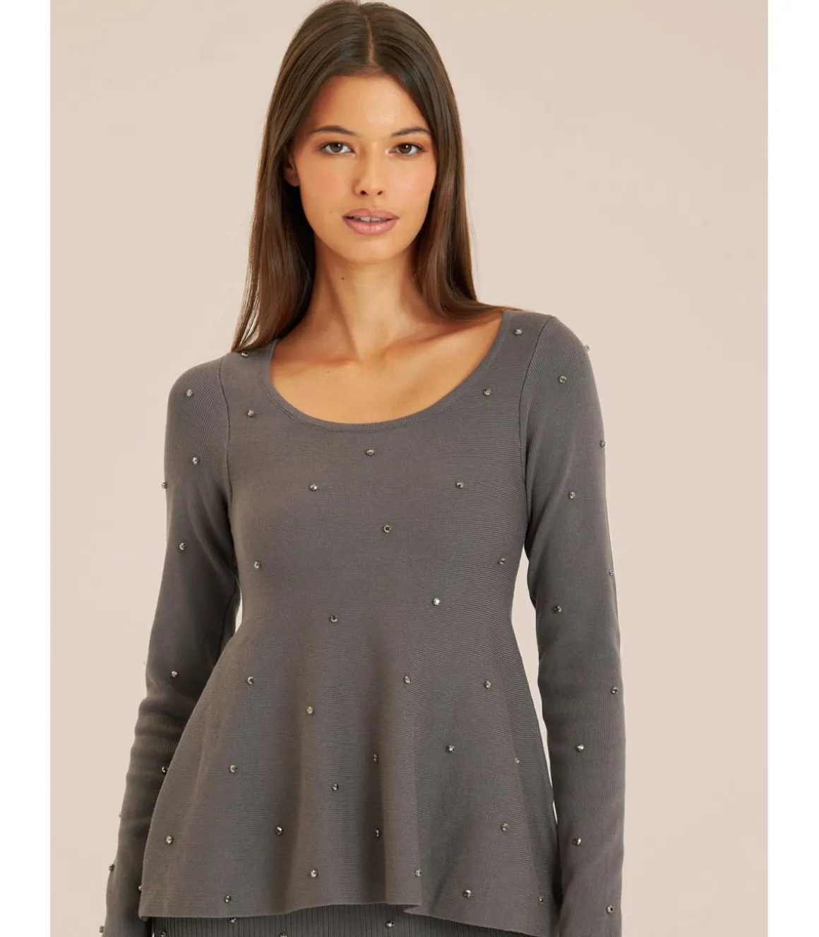 Top de punto de mujer de manga larga con detalle de pedrería. Sin cierre. Medidas de la modelo: altura 1,69cm, pecho 82cm, cintura 60cm y cadera 88cm.