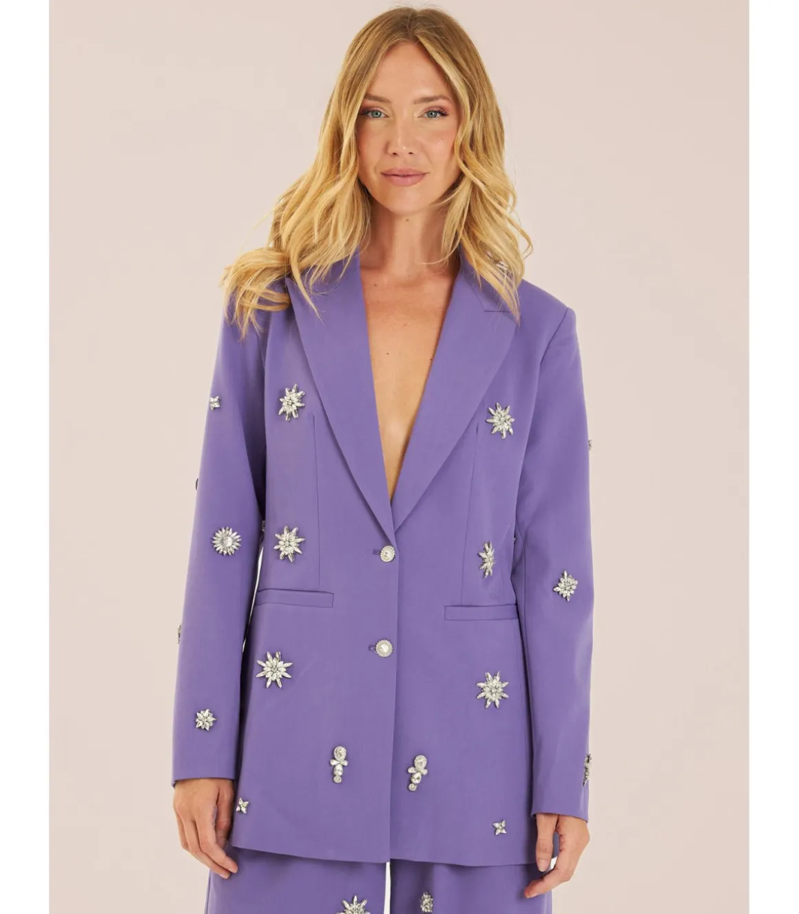 Blazer de mujer con cuello solapa y manga larga cubierta con abalorios de pedrería. Bolsillos delanteros y cierre front…
