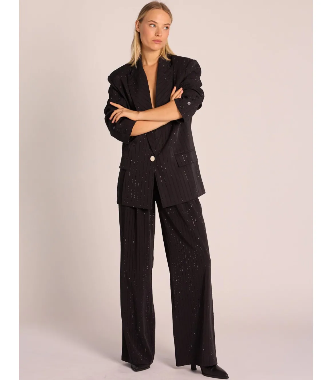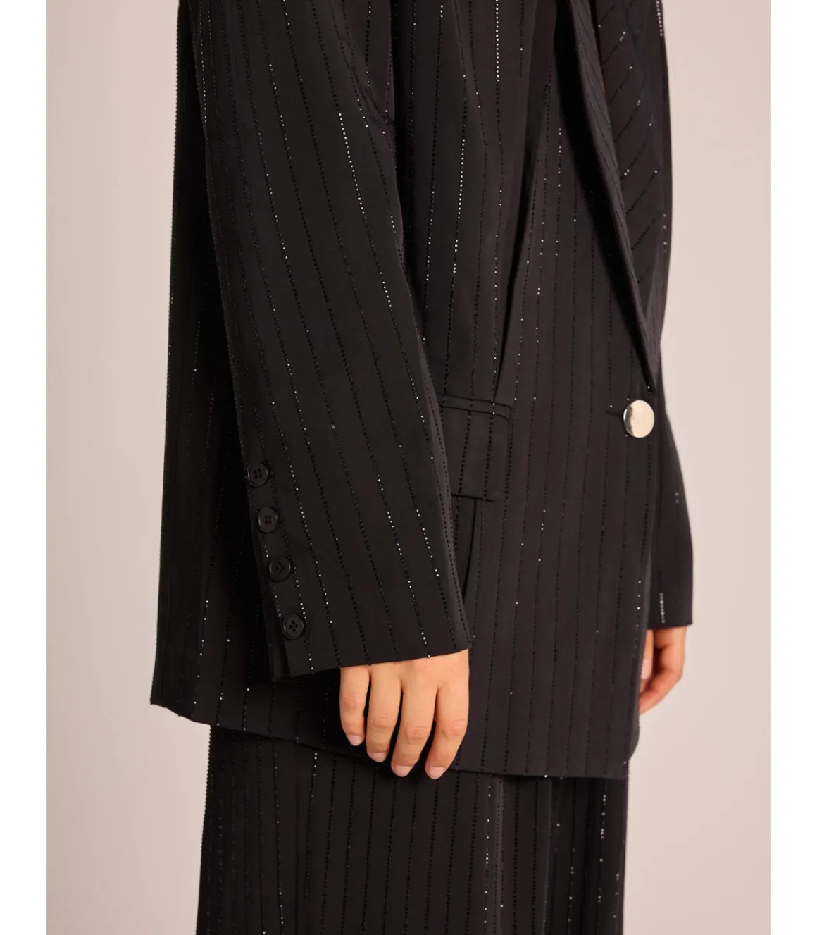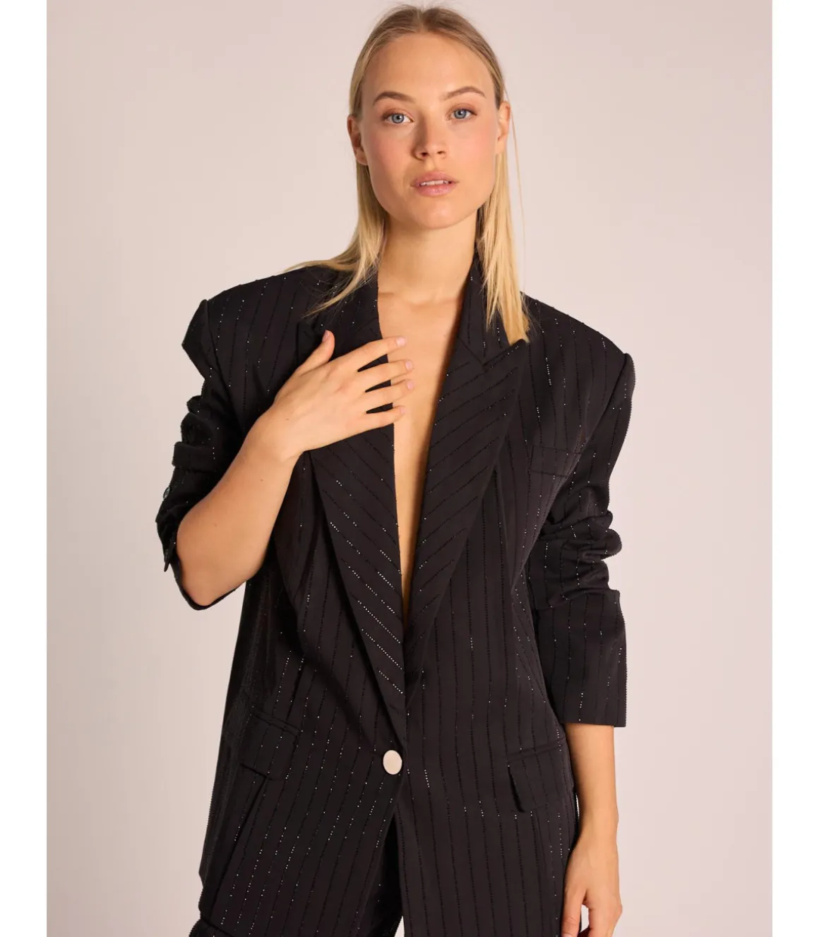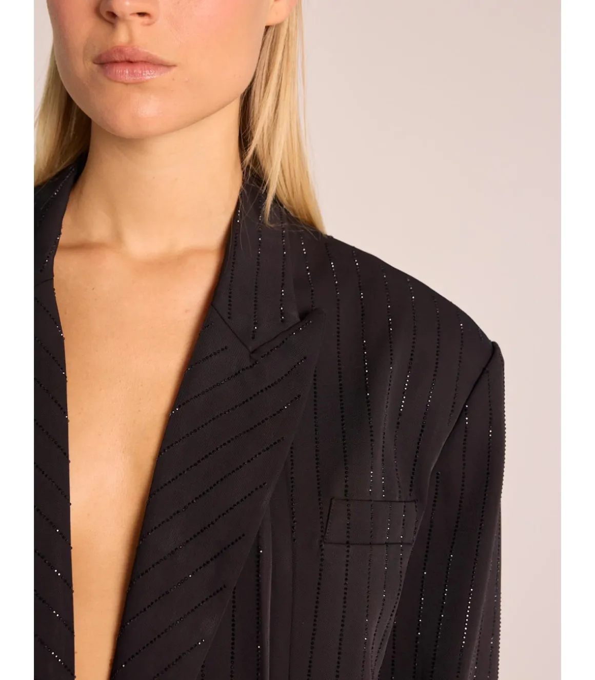 Blazer de mujer con cuello solapa y manga larga tipo raya diplomática con pedrería. Bolsillos delanteros y cierre frontal con botón. Medidas de la modelo: altura 1,69cm, pecho 82cm, cintura 60cm y cadera 88cm.