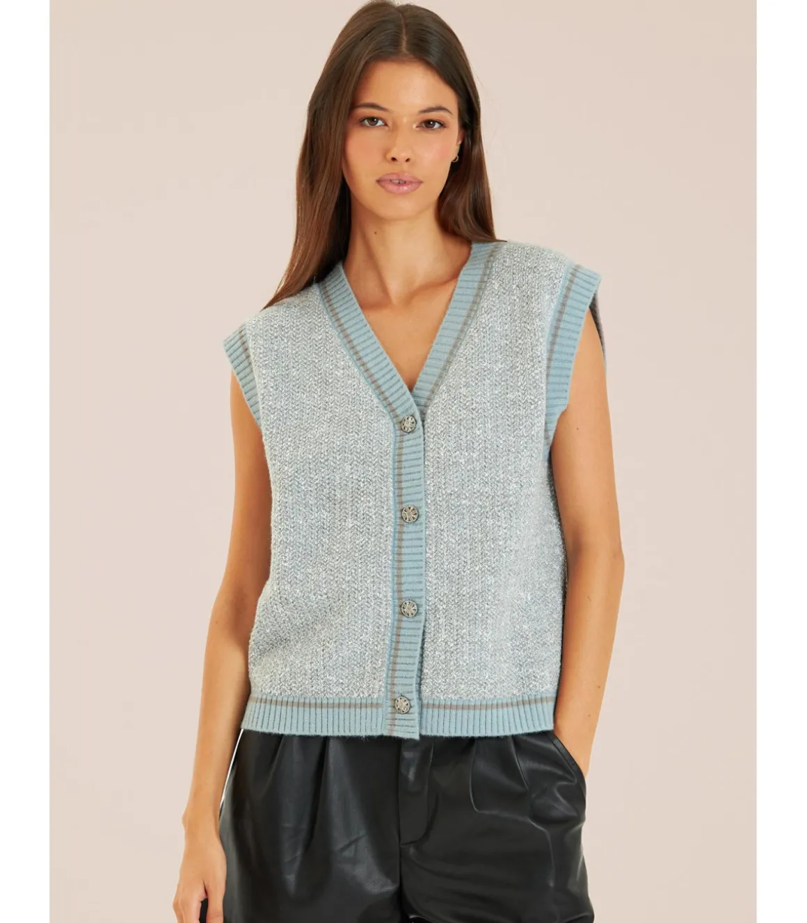 Chaqueta de punto con botón joya de mujer. Cierro con botones y sin mangas. Las medidas de la modelo vistiendo la talla S son: altura 1,68cm, pecho 87cm, cintura 63cm y cadera 88cm.