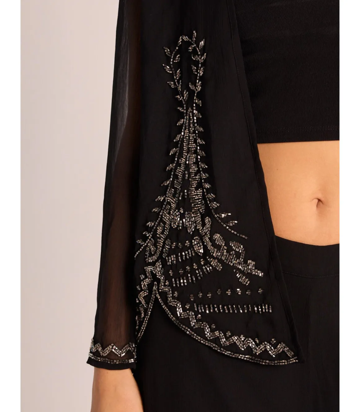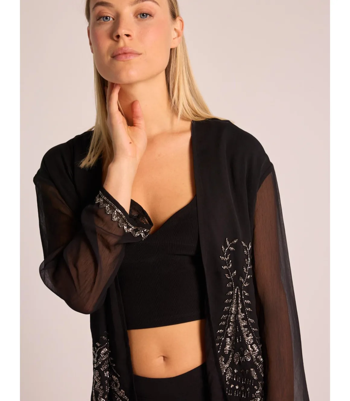 Chaqueta de mujer con abalorios de pedrería. Sin cierre con mangas semi transparentes. Medidas de la modelo: altura 1,69cm, pecho 82cm, cintura 60cm y cadera 88cm.