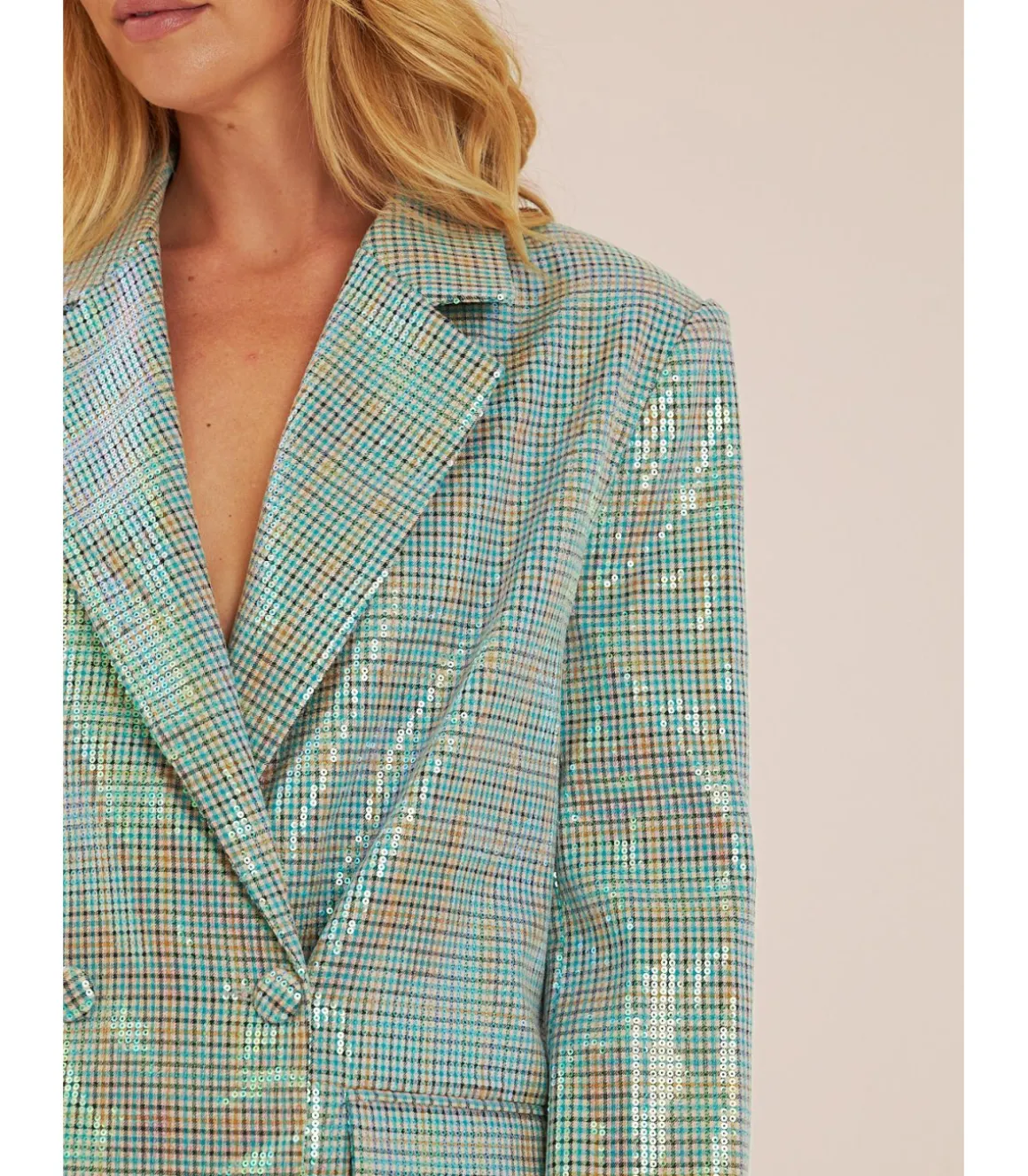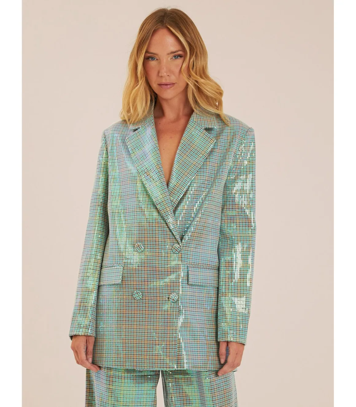 Blazer de mujer con cuello solapa y manga larga cubierta con lentejuelas. Bolsillos delanteros y cierre frontal con botón. Medidas de la modelo: altura 1,69cm, pecho 82cm, cintura 60cm y cadera 88cm.