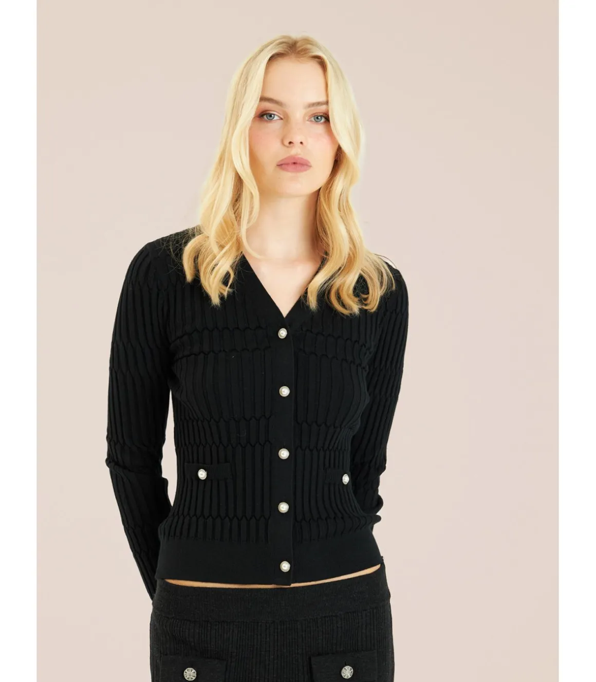 Chaqueta de punto confruncidos de mujer. Cierro con botones joya. Las medidas de la modelo vistiendo la talla S son: altura 1,68cm, pecho 87cm, cintura 63cm y cadera 88cm.