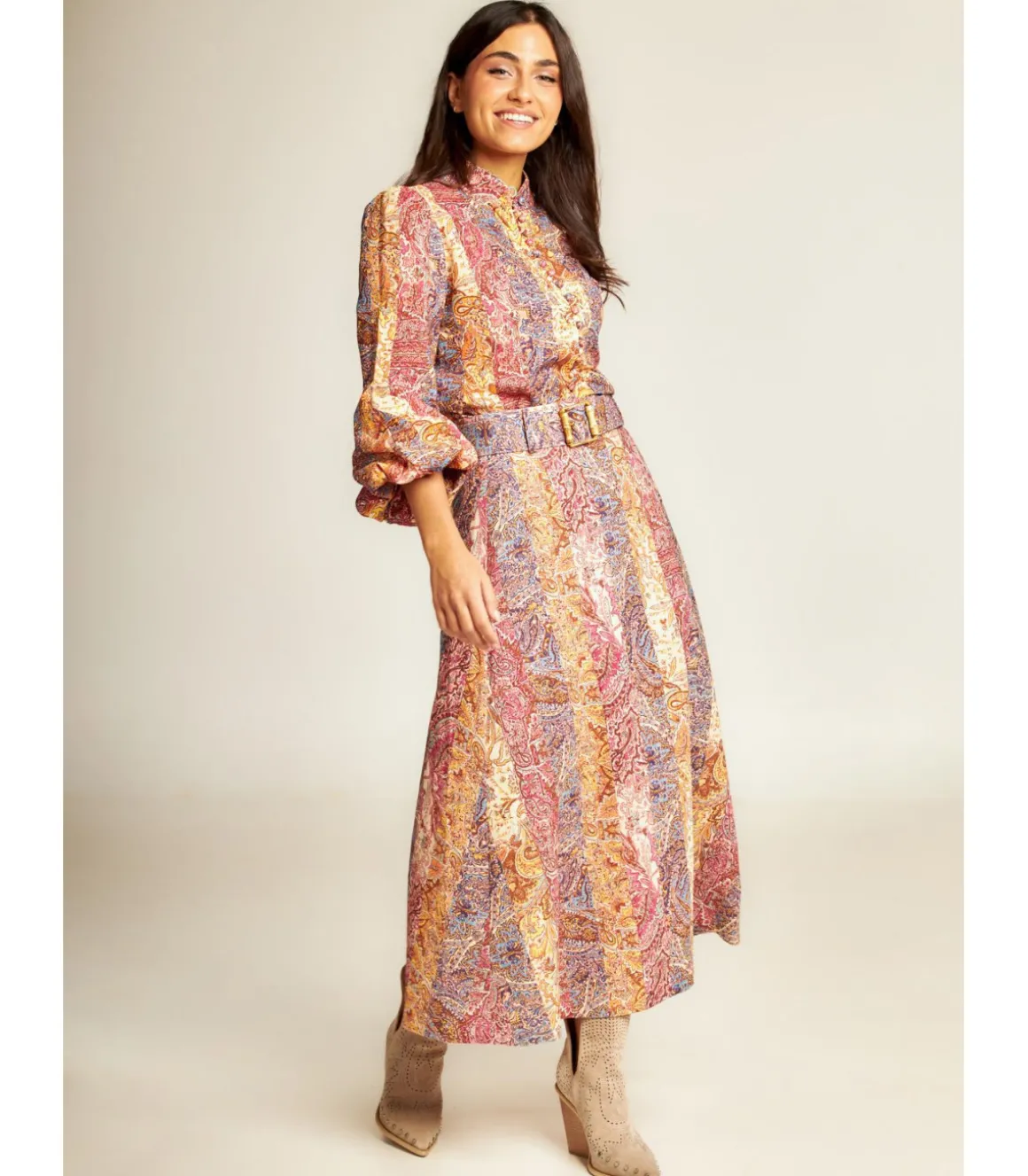 Falda larga estampada con cinturón. Confeccionado un 80% en ramio y un 20% en algodón. Cierre con cremallera y cinturón. Las medidas de la modelo vistiendo la talla S son: altura 1,68cm, pecho 87cm, cintura 63cm y cadera 88cm.