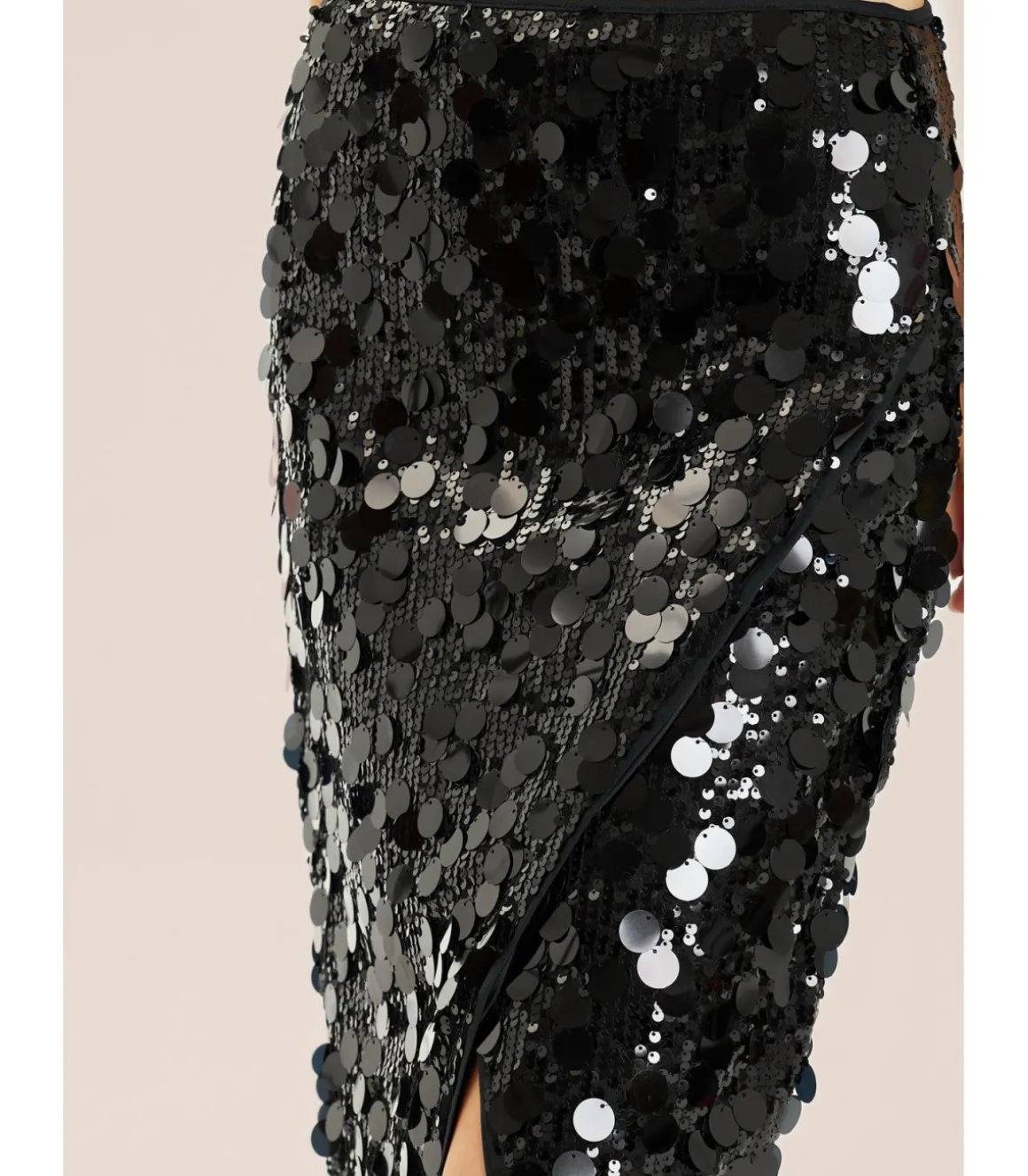 Falda midi cubierta con lentejuelas de mujer. Cierre con cremallera y apertura en la parte delantera. Medidas de la mode…