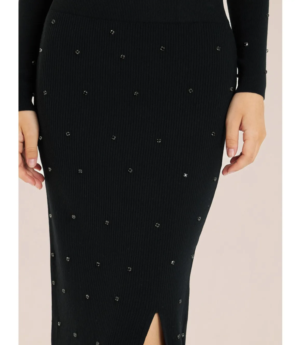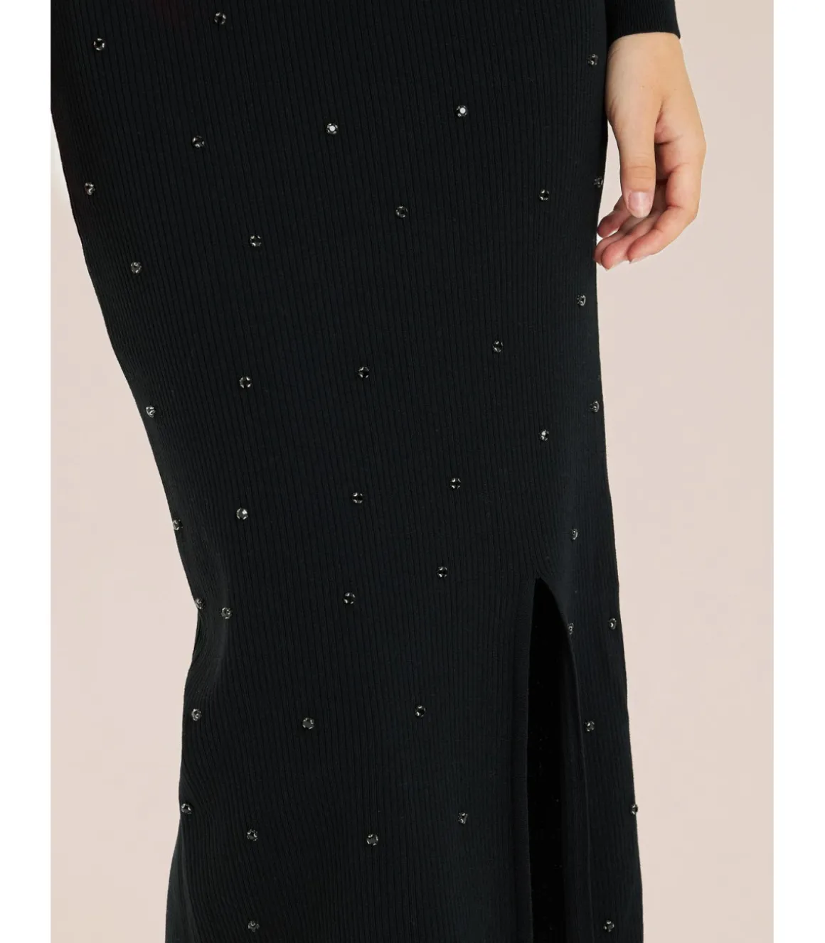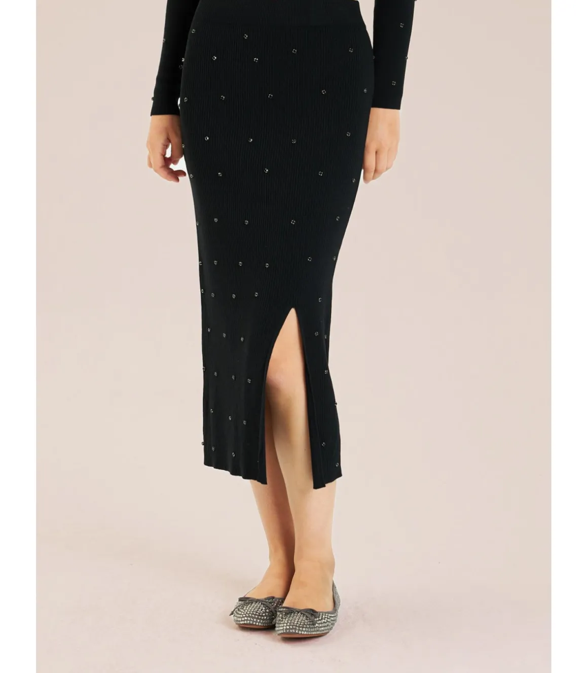 Falda midi de punto para mujer con detalles de pedrería. Sin cierre, con cintura elástica y apertura en la parte delan…