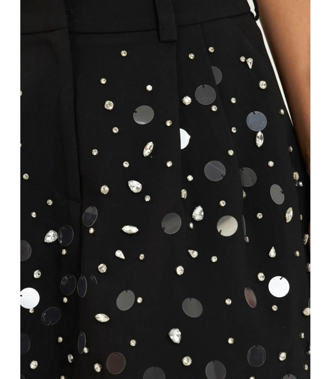 Falda fantalón de mujer confeccionada el poliéster un 74%. Con detalles de abalorios en la parte delantera y cierre con cremallera. Las medidas de la modelo vistiendo la talla S son: altura 1,68cm, pecho 87cm, cintura 63cm y cadera 88cm.
