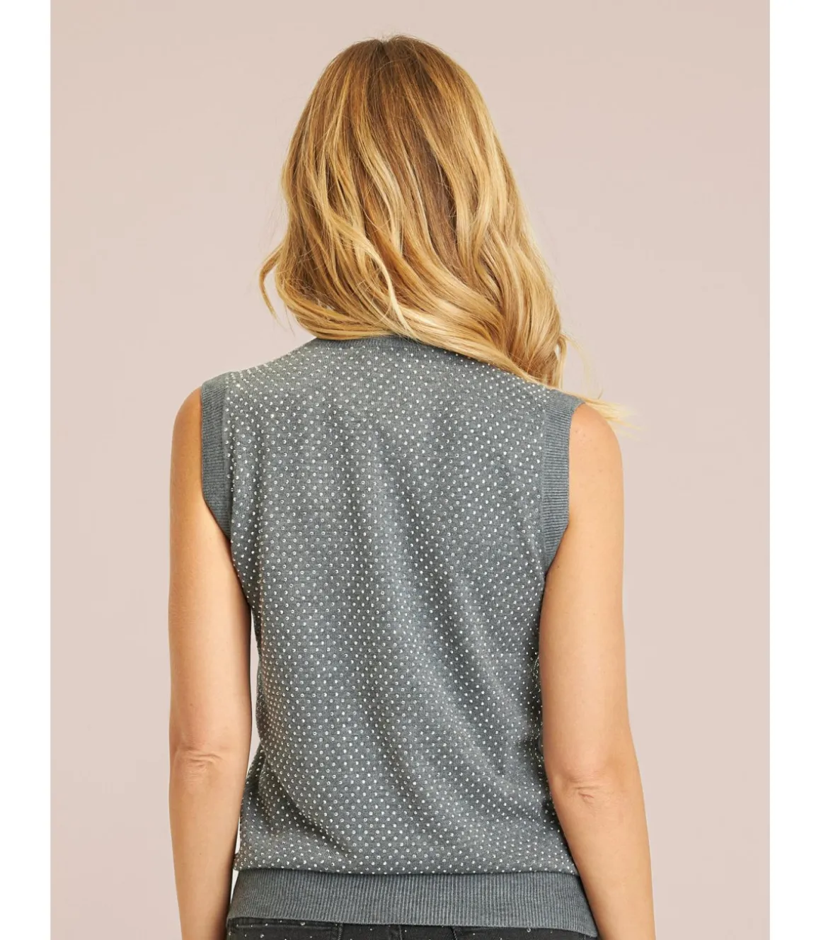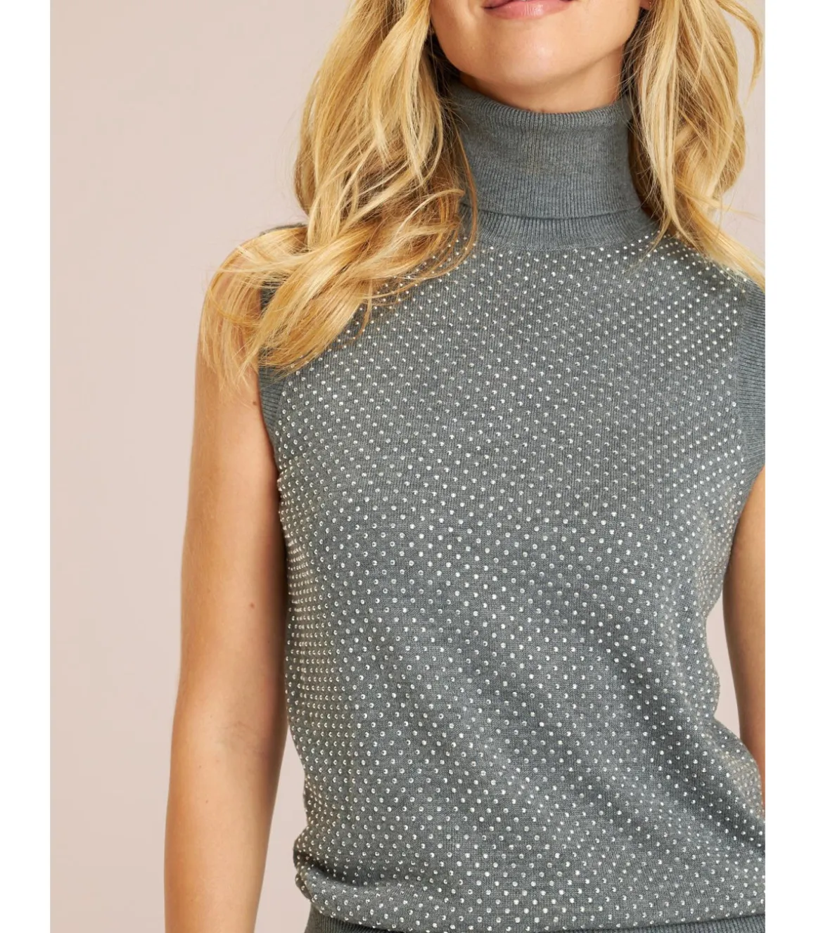 Jersey de punto de mujer con cuello alto y sin mangas. Cubierto de pedrería y sin cierre. Medidas de la modelo: altura 1,69cm, pecho 82cm, cintura 60cm y cadera 88cm.