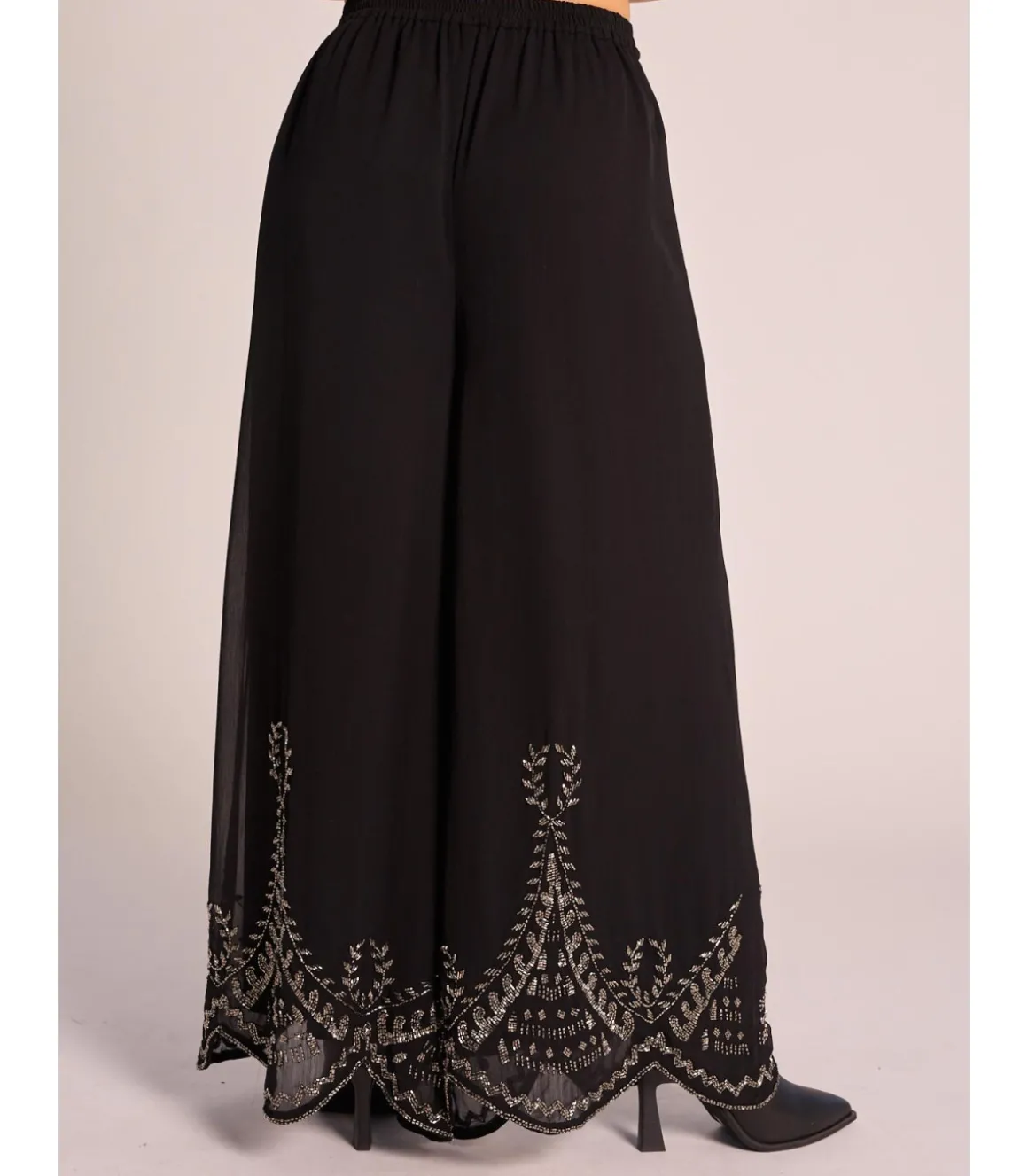 Pantalón largo de mujer, confeccionado en poliéster con detalles bordados en hilo metalizado. Tiro alto con cintura elástica. Medidas de la modelo: altura 1,69cm, pecho 82cm, cintura 60cm y cadera 88cm.