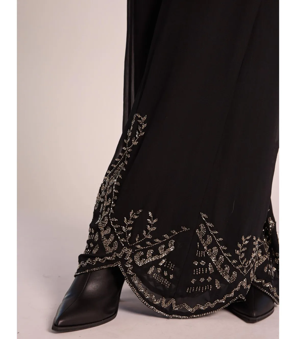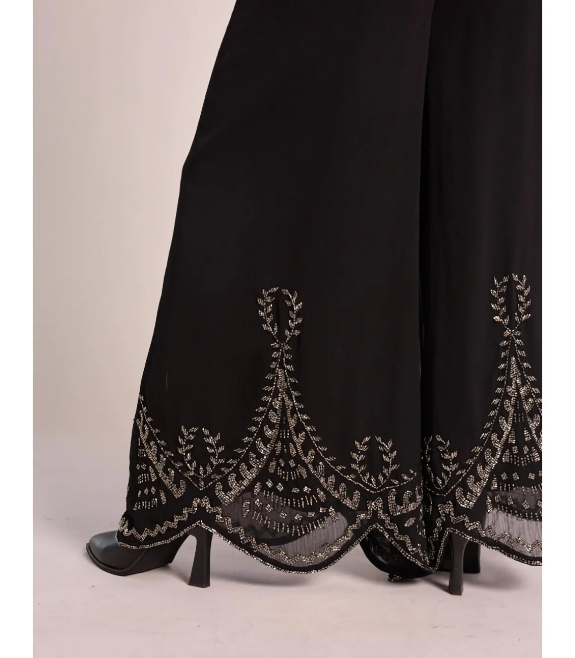 Pantalón largo de mujer, confeccionado en poliéster con detalles bordados en hilo metalizado. Tiro alto con cintura el…