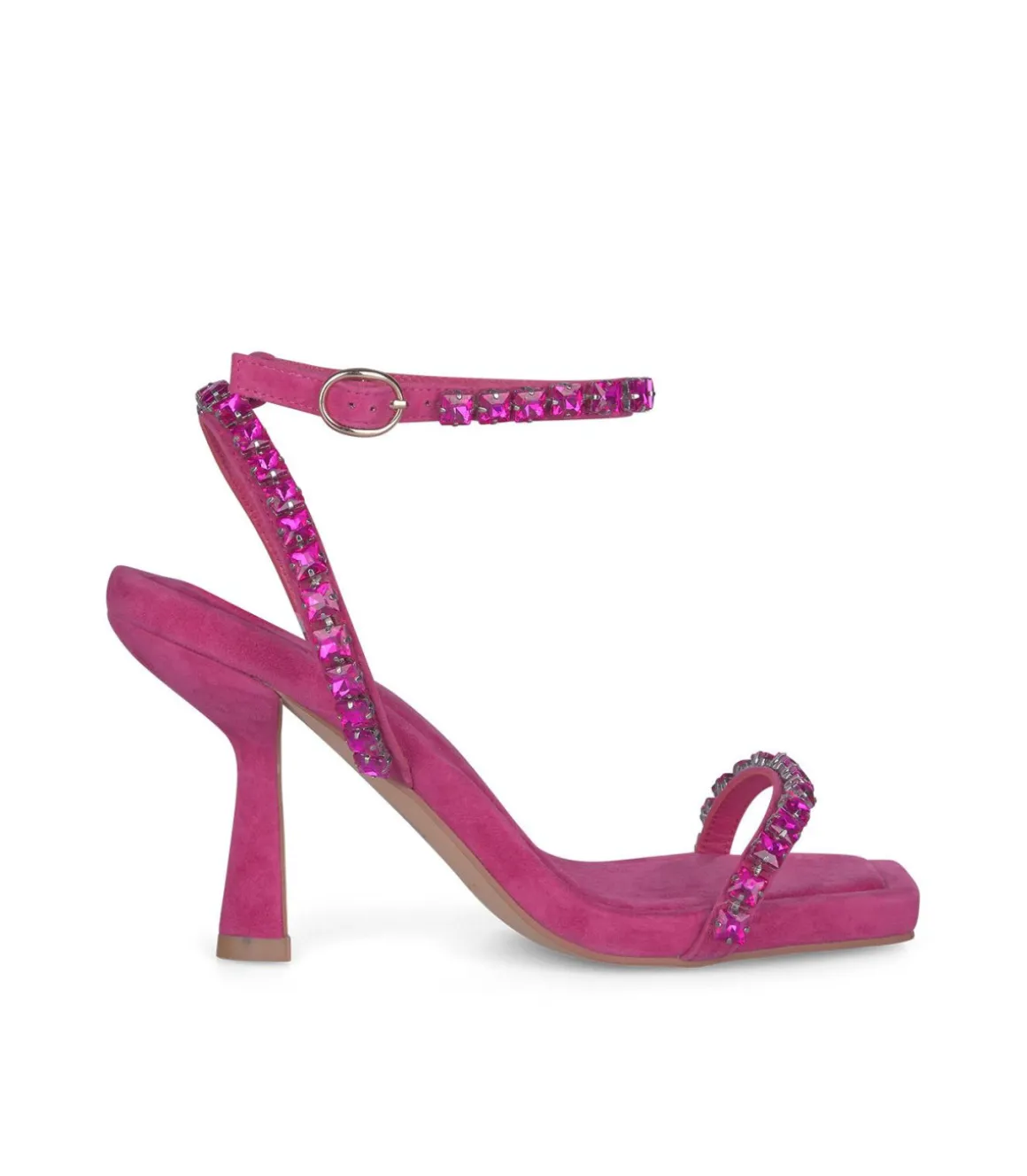 Sandalia de tacón de mujer con tiras de pedrería. Sin cierre, la altura del tacón es de 9cm.